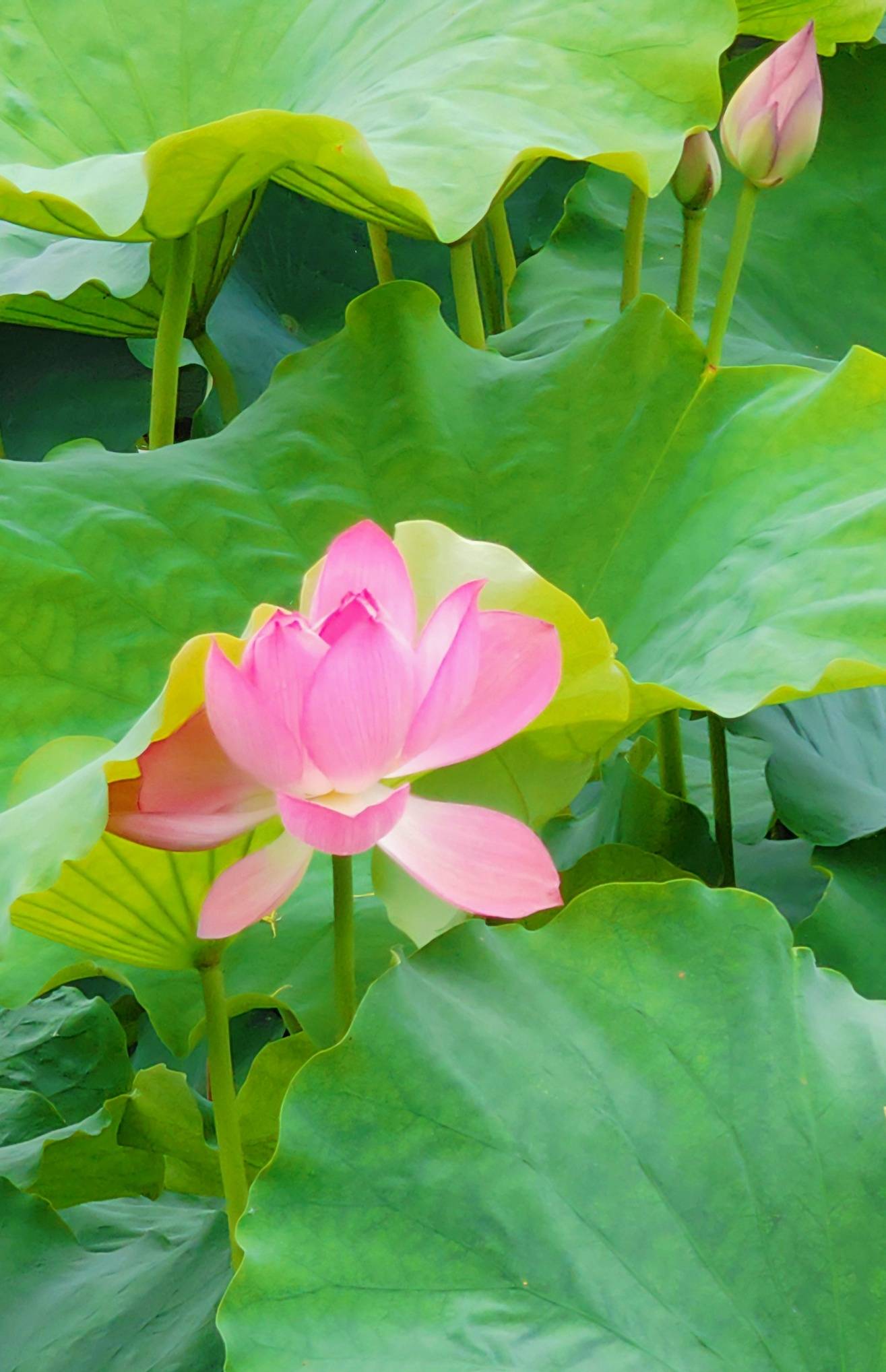 粉嫩的花朵在连片荷叶的映衬下随风轻舞、摇曳生姿。