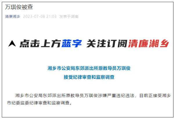 微信公众号“清廉湘乡”7月8日消息,湖南湘乡市公安局东郊派出所原教导员万琪俊涉嫌严重违纪违法,目前正接受湘乡市纪委监委纪律审查和监察调查。