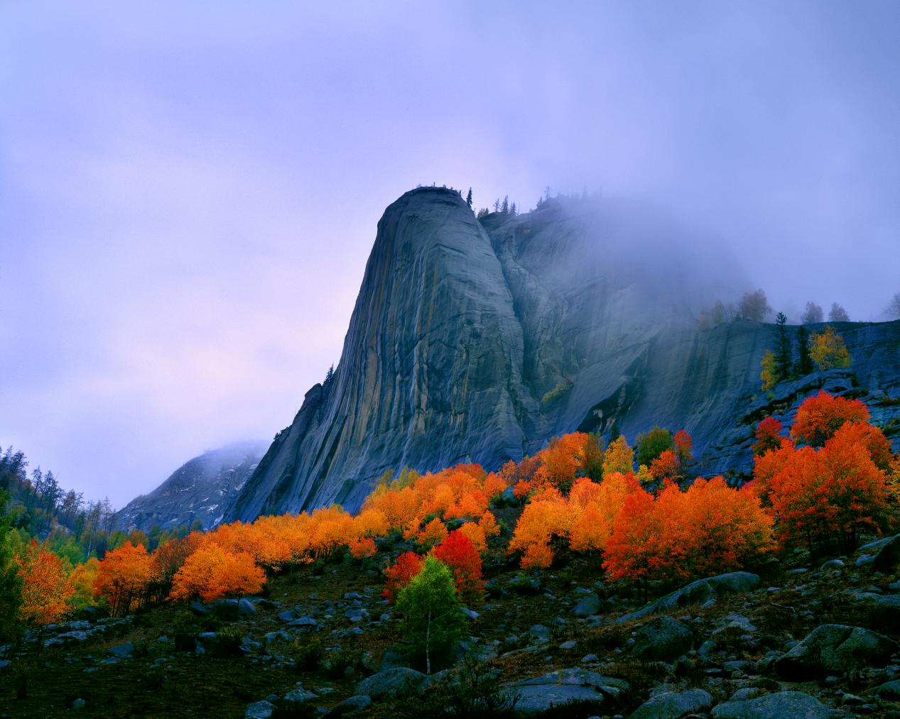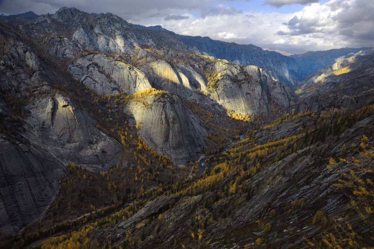 一块块体态丰华的大石摞砌在一起,大石与大石之间奋力挤出的青丝花红点缀其间,云杉、落地松、红叶树,还有小松鼠、鸟,构成了可可托海的山。一座座形态各异的山峰,逆河而上,直入云霄,钩射出天宫一般的神话。