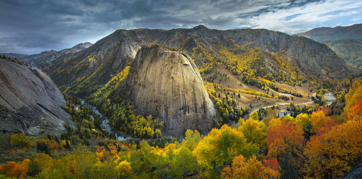穿行在额尔齐斯大峡谷之中,花岗岩地貌是这里最鲜明的特征。它以独特的钟状、穹状、锥状峰丛山体出现,平地拔起,气势逼人,极其雄伟壮观,令人感叹不已,可谓独树一帜、天下不二。神钟山独石成峰,成为了可可托海著名的景点之一,钟山通体光滑,寸草不生,孤峰傲立,巍峨神奇,堪称阿勒泰山景之最。钟山高365米,坡度89度,被誉为“中华神州第一钟”,来此观景者无不发出对大自然造物之神奇的感叹。总而观之,钟山之北,重层峦叠嶂,臻臻簇簇,有翻江倒海之巨势;钟山之南,崚嶒嵯岈,汤汤峨峨,有仙都羽化之灵姿。山北之雄浑与山南之纤巧相映成趣,动静相宜,雄纤得体,共同展示着造化之玄秘。