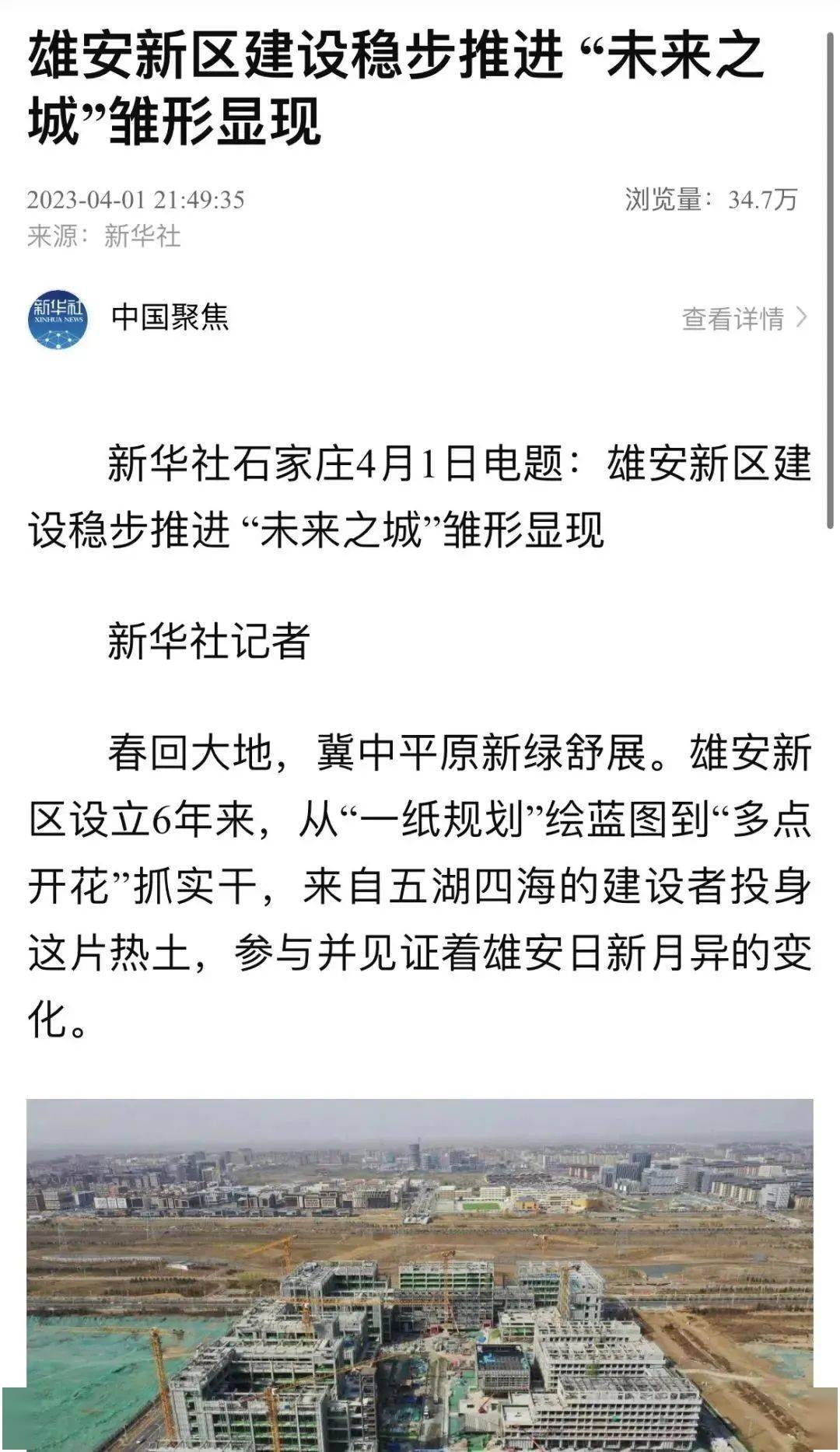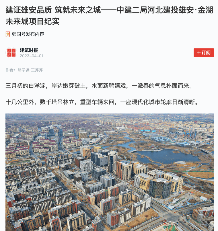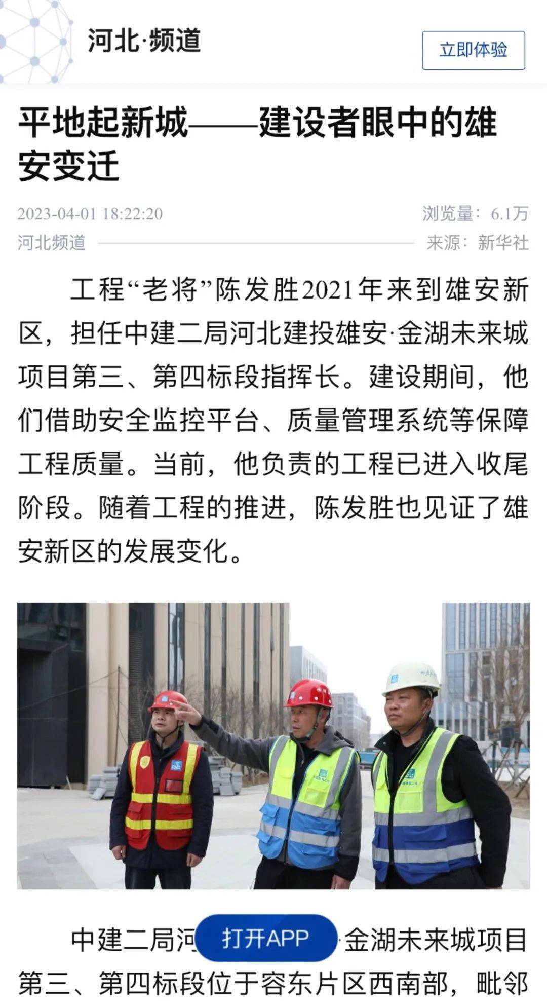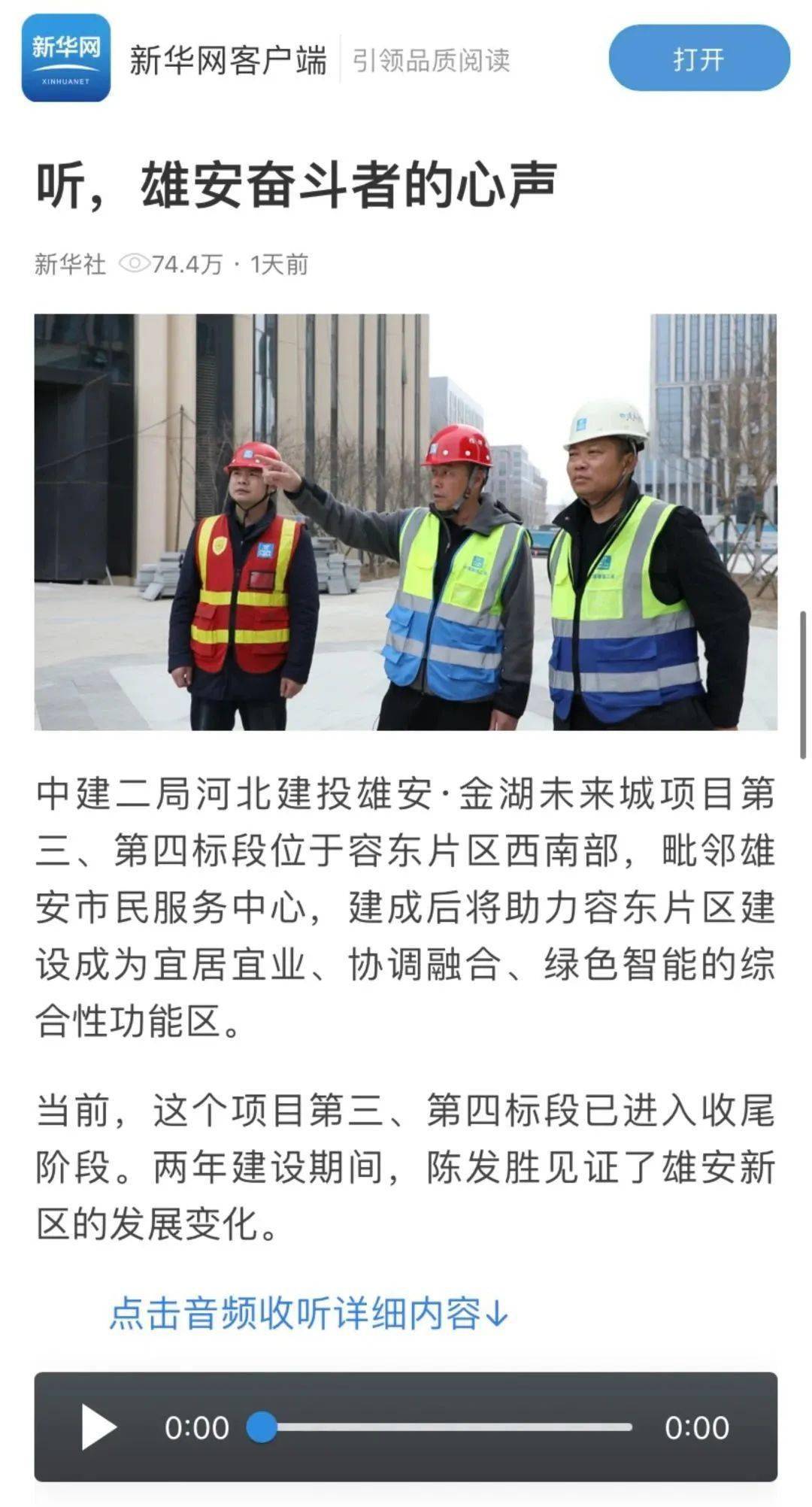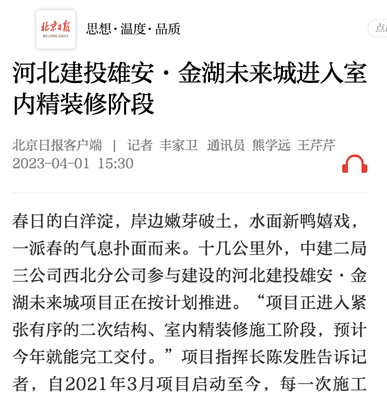 4月1日,新华社资讯《 听,雄安奋斗者的心声》一文报道中建二局三公司河北建投雄安·金湖未来城第三四标段项目建设内容。