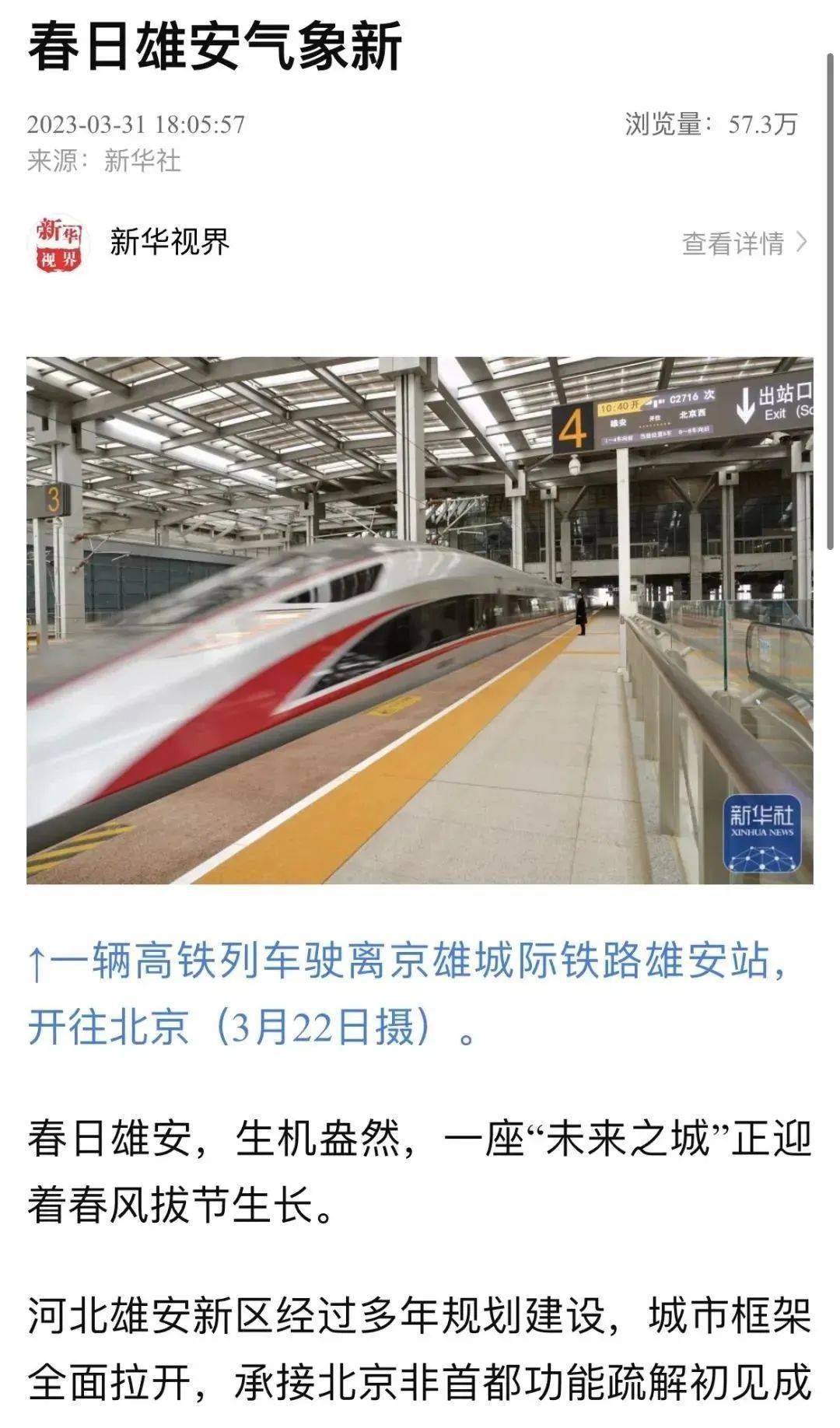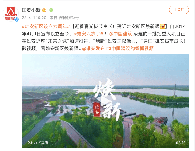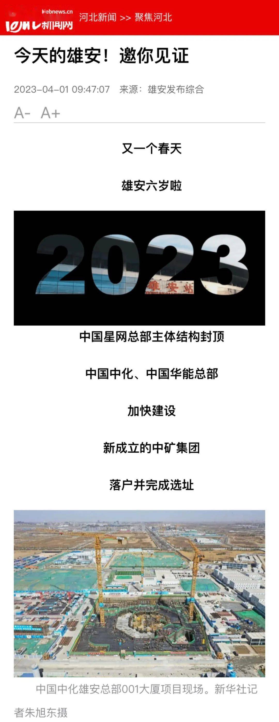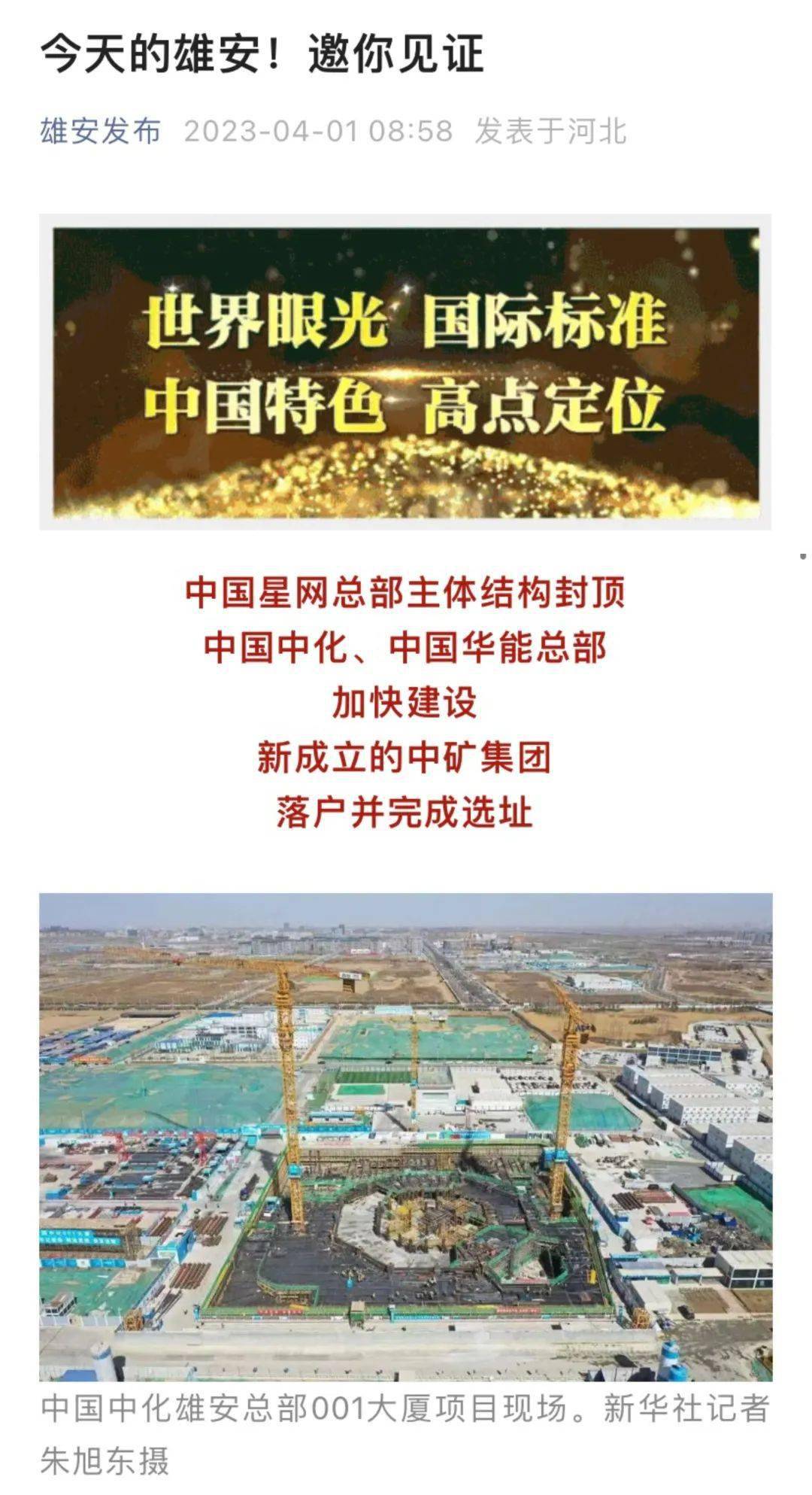 3月31日,新华社新华视界《 春日雄安气象新》一文报道中建二局三公司中国中化总部001大厦项目建设内容。
