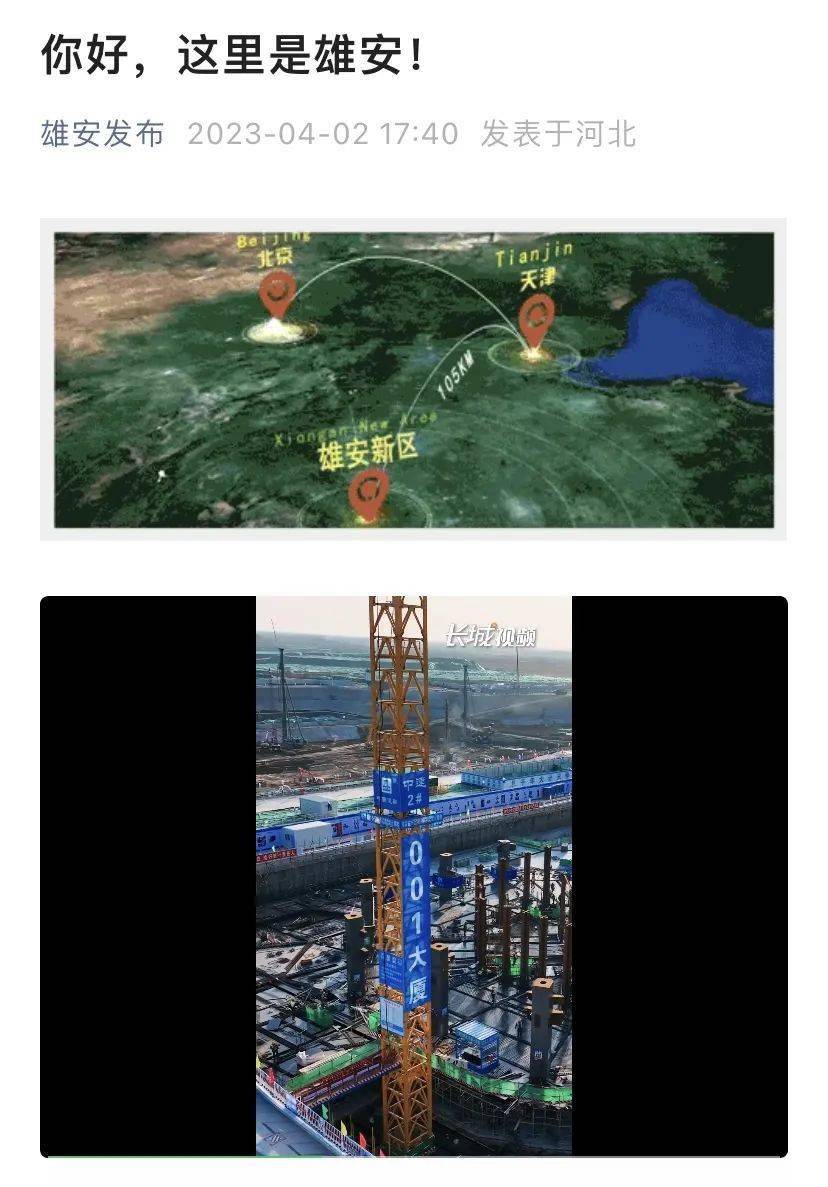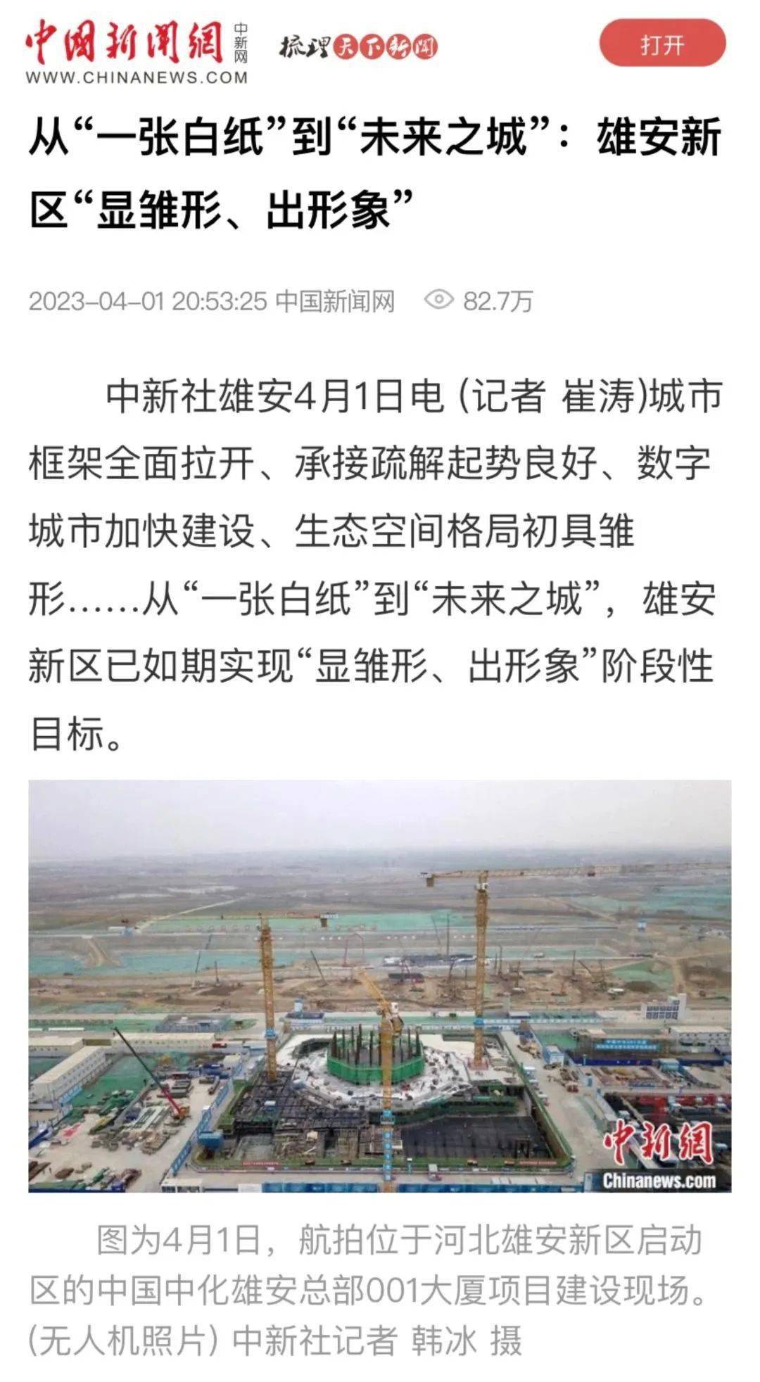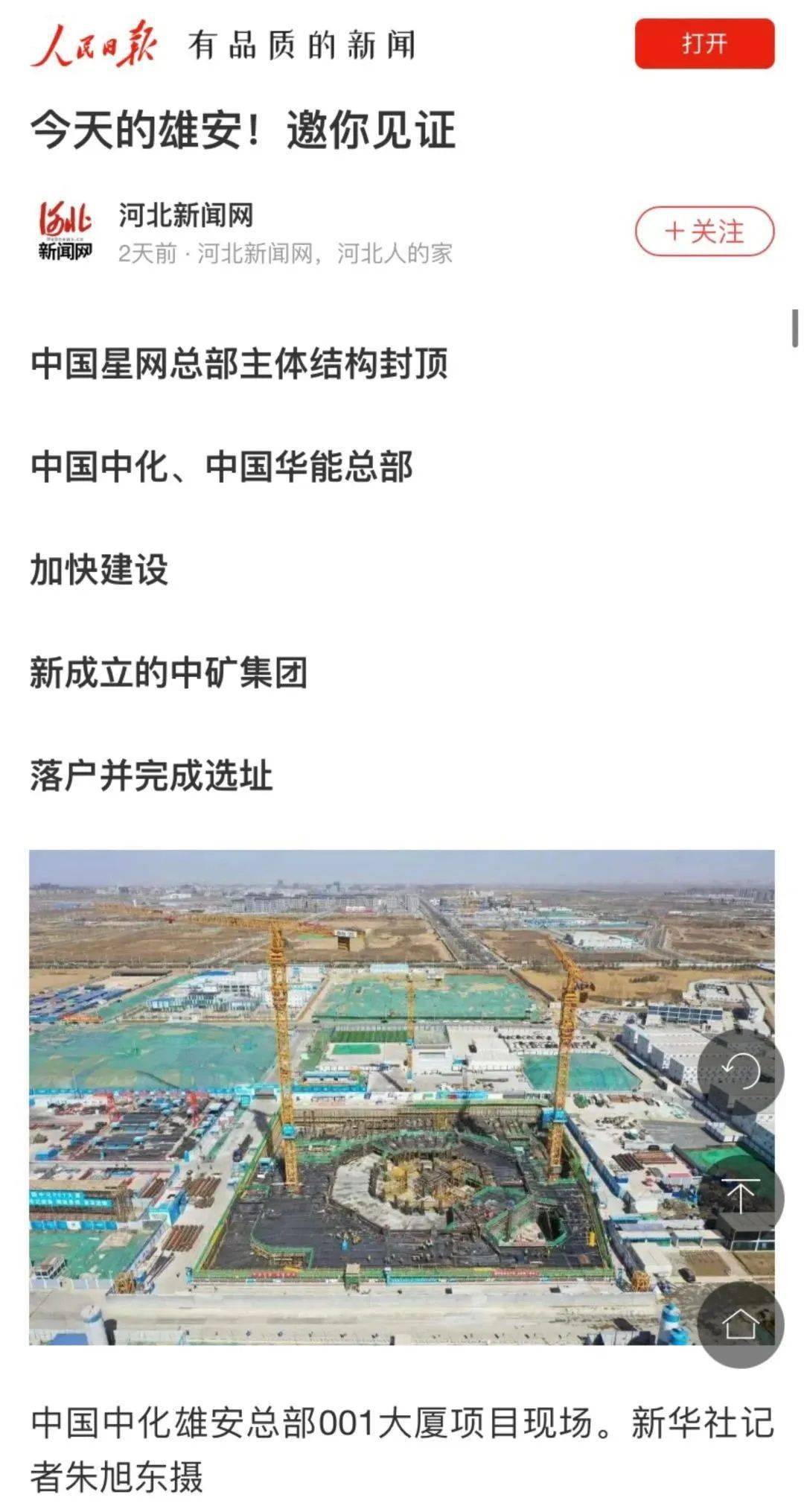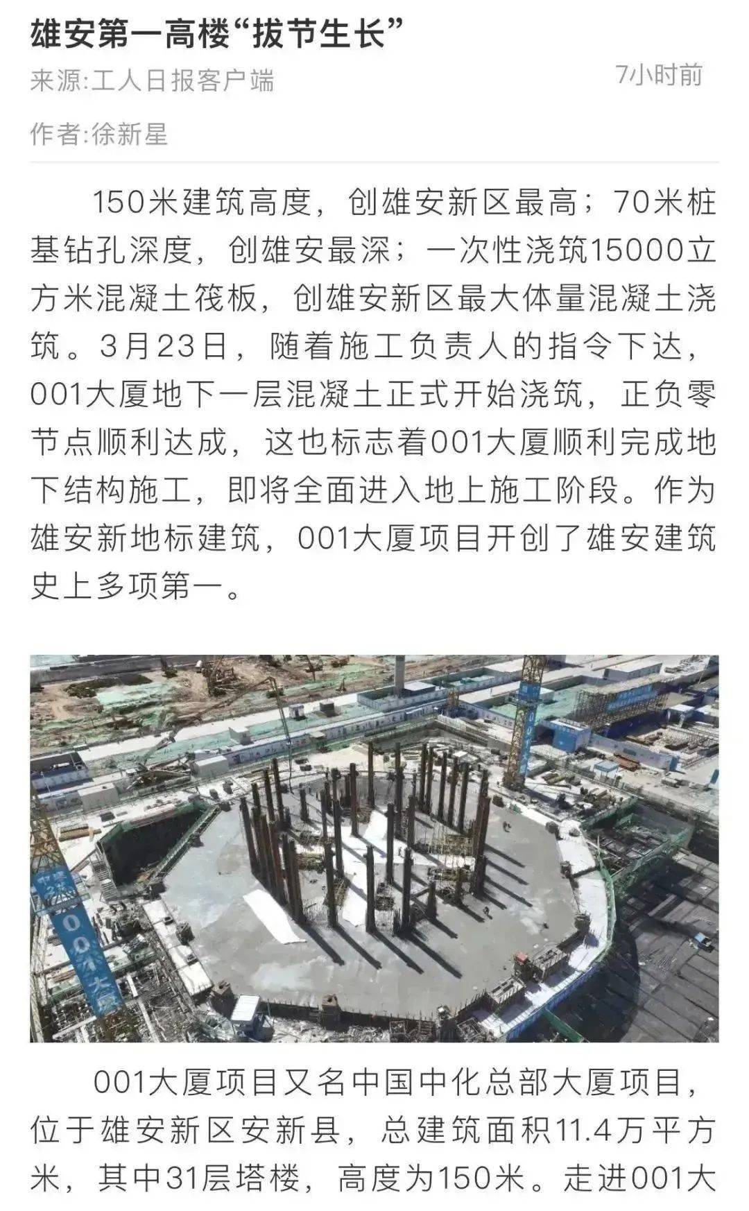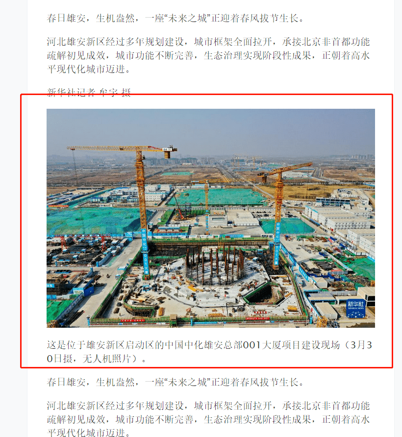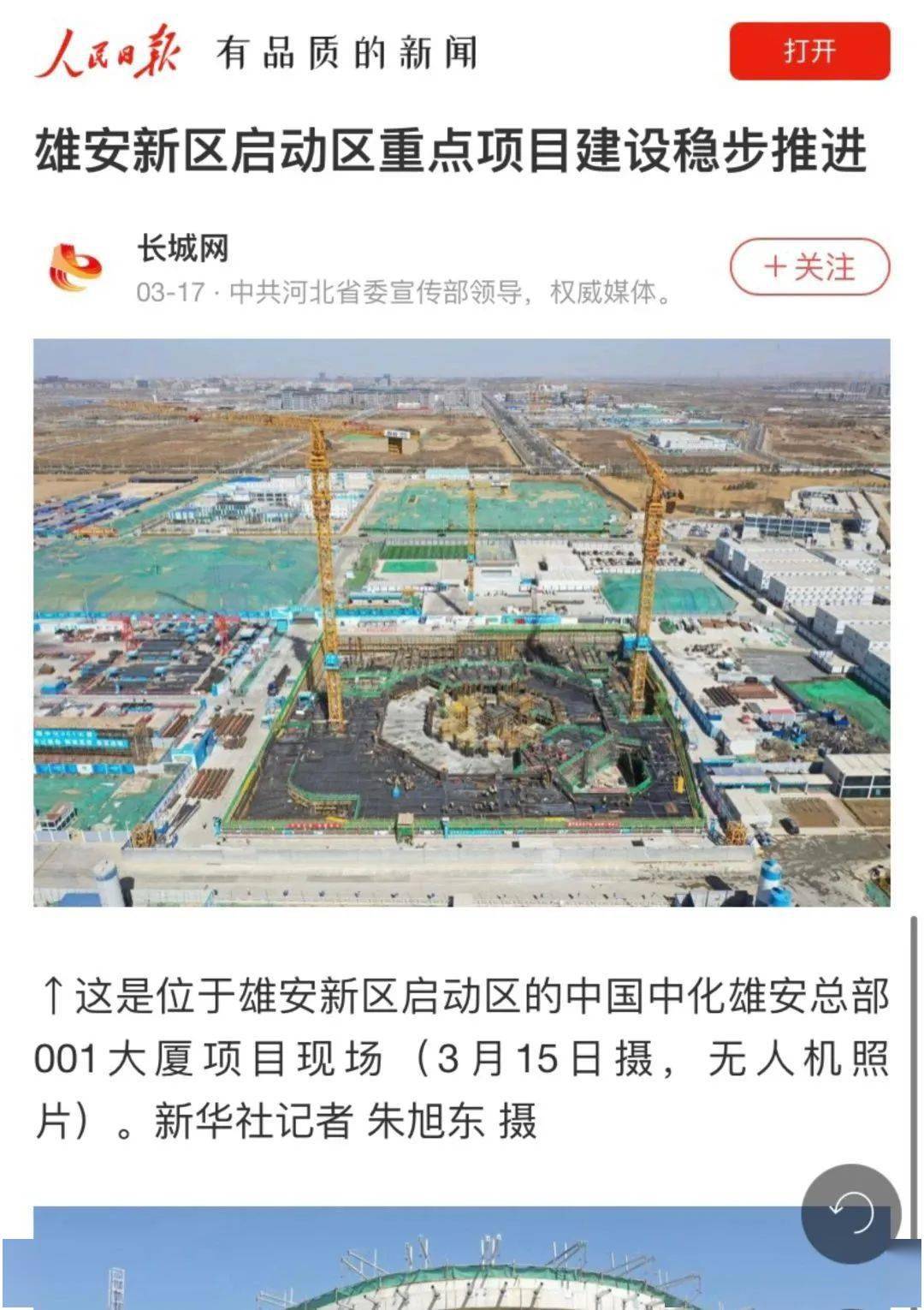 4月1日,新华全媒+《 问记者|卫星视角下,雄安六年有什么变化?》一文报道中建二局三公司中国中化总部001大厦项目建设内容。