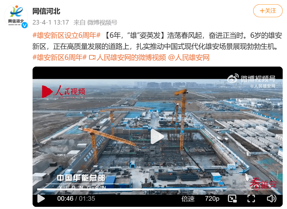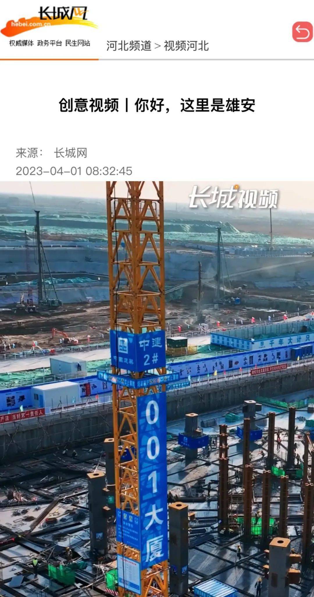 4月1日,新华社新华视频《 微视频|雄安,一座“未来之城”》一文报道中建二局三公司中国中化总部001大厦项目建设内容。