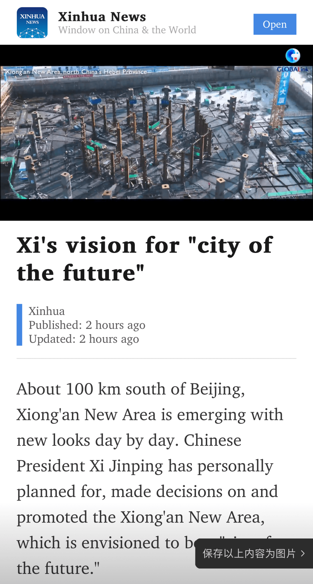 4月1日,新华社海外《 Xi's vision for "city of the future"》一文报道中建二局三公司中国中化总部001大厦项目建设内容。