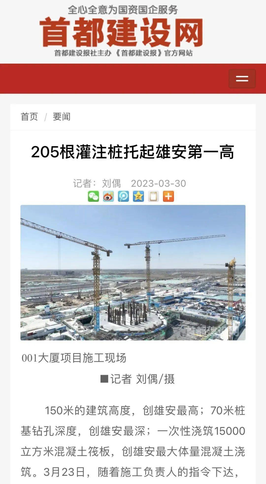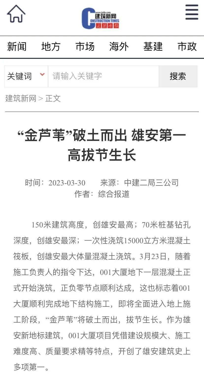 3月31日,新华网客户端《 春日雄安气象新》一文报道中建二局三公司中国中化总部001大厦项目建设内容。
