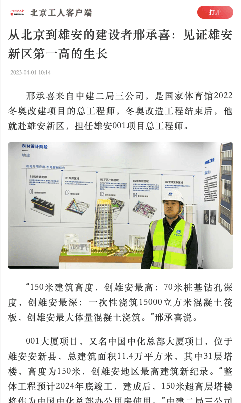 4月1日,新华社中国聚焦《 雄安新区建设稳步推进 “未来之城”雏形显现》一文报道中建二局三公司中国中化总部001大厦项目建设内容。