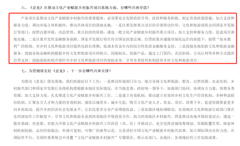 2022年,文化和旅游部 教育部 自然资源部 农业农村部 国家乡村振兴局 国家开发银行联合印发《关于推动文化产业赋能乡村振兴的意见》中提出,按照自愿申报、动态管理、重点扶持的原则,遴选一批文化产业赋能乡村振兴重点项目,加大支持和服务力度,促进项目落地实施。国家开发银行在符合国家政策法规、信贷政策并遵循市场化运作的前提下,按照“保本微利”的原则,对乡村文化和旅游项目提供包括长周期、低成本资金在内的综合性优质金融服务支持。