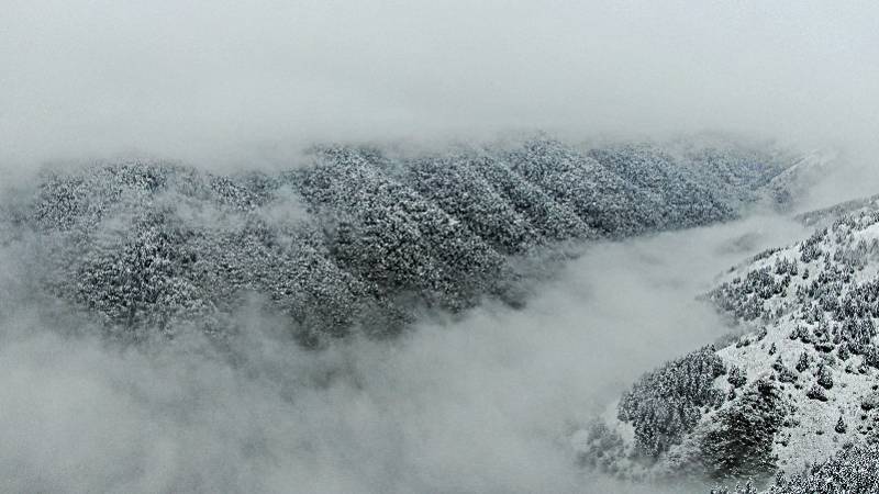 2022年5月14日,雪后的甘肃宕昌县南河沟云雾缭绕。时值初夏,甘肃陇南市宕昌县一些地区日前却出现降雪,白雪与青山、草原构成神奇的初夏雪景图。 新华社发