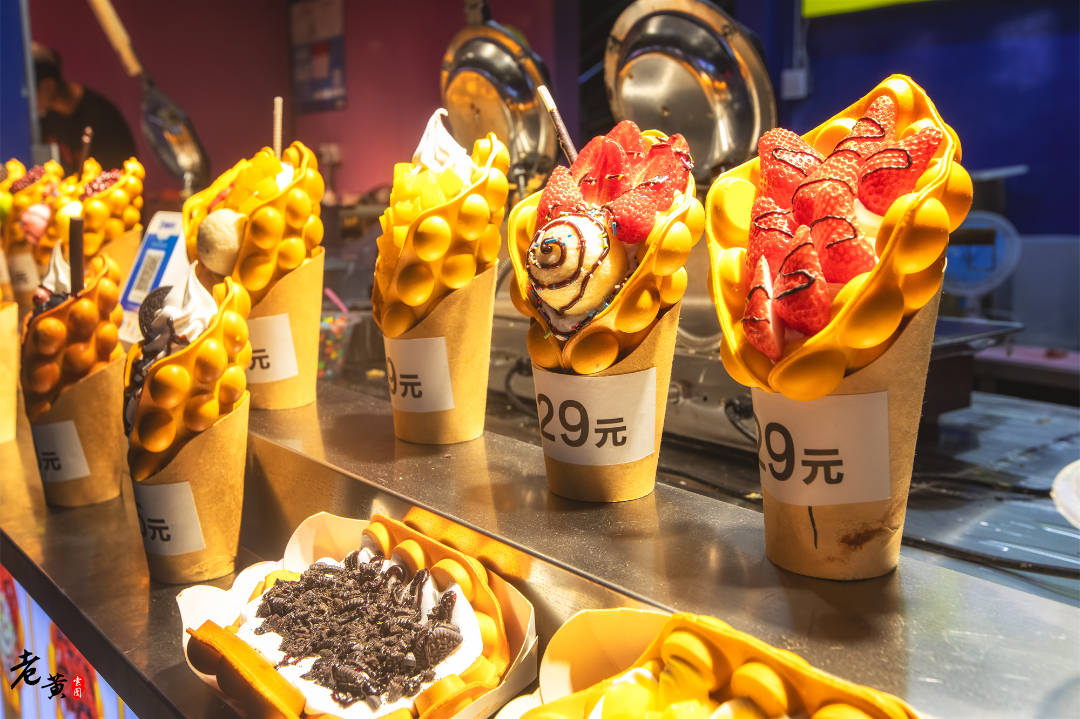 整个市集有超过5000平方米的范围,可谓是大场面了。这里有许多各式各样的美食,比如炒焖子、烤鱿鱼、手打柠檬茶、摇摇冰等等,总之从大连本地特色小吃到网红产品一应俱全。而且不仅有美食,还有许多文创商品,是非常综合的一条长街集市,乐趣多多!