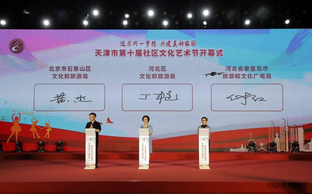 天津市文化和旅游局、河北区人民政府联合主办的天津市第十届社区文化艺术节于7月8日晚在北宁公园开幕。天津市文化和旅游局副局长、一级巡视员左坚,天津市城市管理委员会二级巡视员翟千德,天津市民政局副局长张清玲,天津市文学艺术界联合会党组副书记、专职副主席施琪,河北区委副书记、区长戴雷,河北区人大常委会主任闫浩,河北区政协主席李秋增出席开幕式。北京市石景山区、河北省秦皇岛市及天津市各区文旅部门,河北区相关部门领导及企业家代表参加活动。活动上,北京市石景山区文化和旅游局与天津市河北区文化和旅游局签订合作框架协议,充分发挥京津两地的资源优势,积极推进北京市石景山区和天津市河北区在文化艺术领域及文旅产业发展方面的深度合作与交流。双方将在文化交流合作,旅游产品打造等方面进行深度合作。