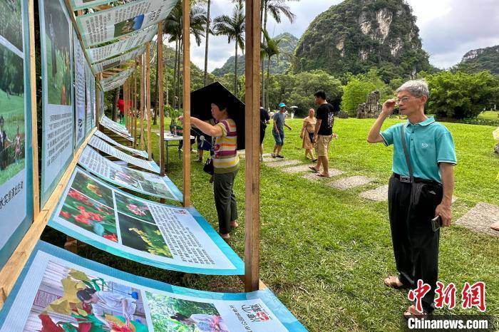 图为游客正在观看美人蕉介绍展牌。 韦国政 摄
