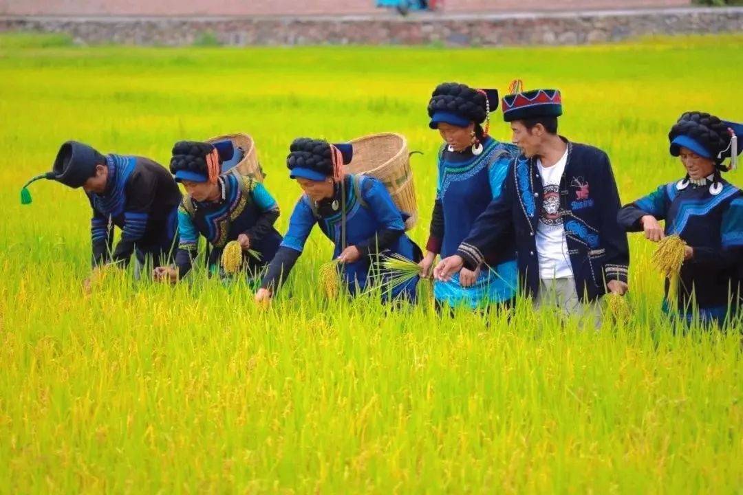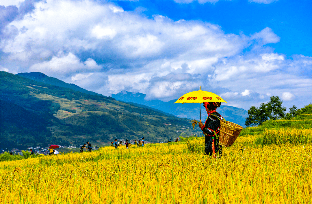 蓝天白云下,身着节日盛装的彝族村民在上万亩的梯田里,抽取成熟稻穗,欢声笑语弥漫田间。