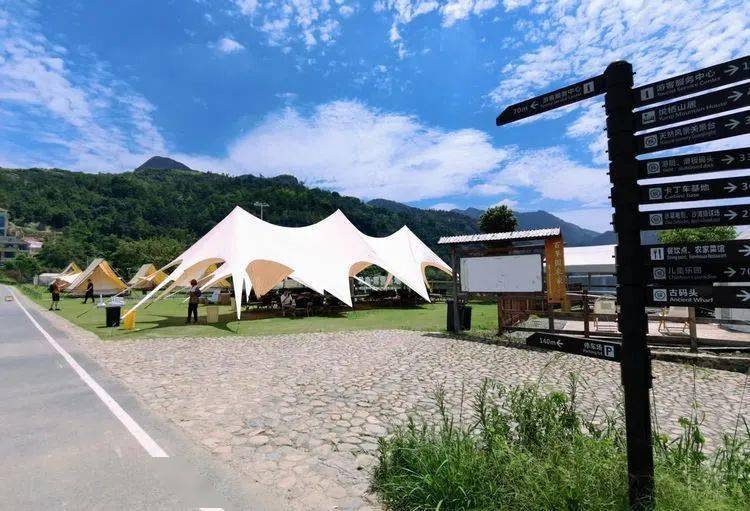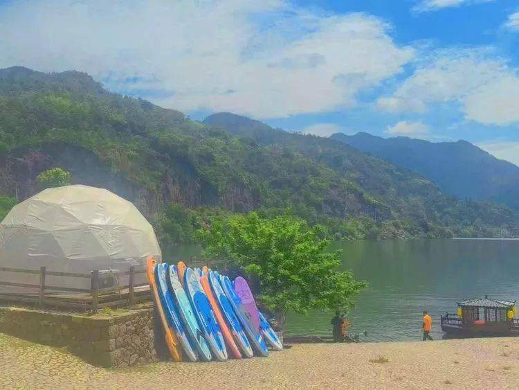 沿溪滩行,右边是悠悠江滩,左边有树木葱茏,随着幽竹小径深入,看见这里除了有网红沙滩,水上运动游船,森林卡丁车,农家乐,悦栖民宿等,还有网红露营基地和动力冲浪营地……