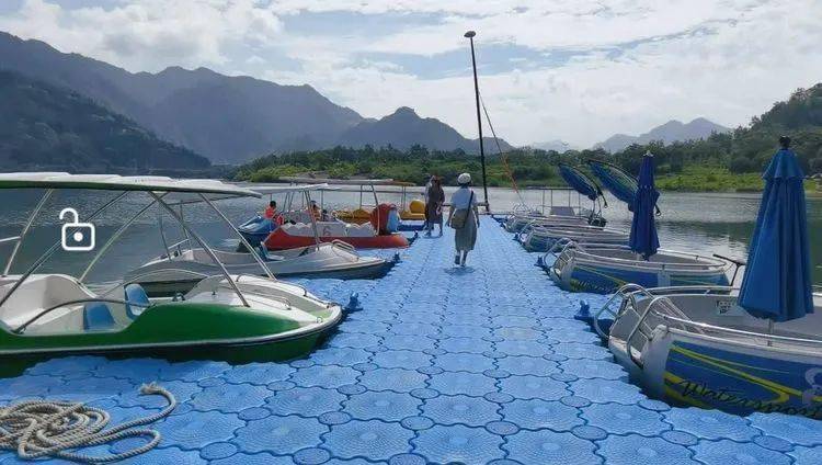 坐在滨水码头,见浮动码头停满了色彩鲜艳的游艇、画舫和漂流游船。不远处就是孩子们最爱的人工沙滩和滑梯乐园。