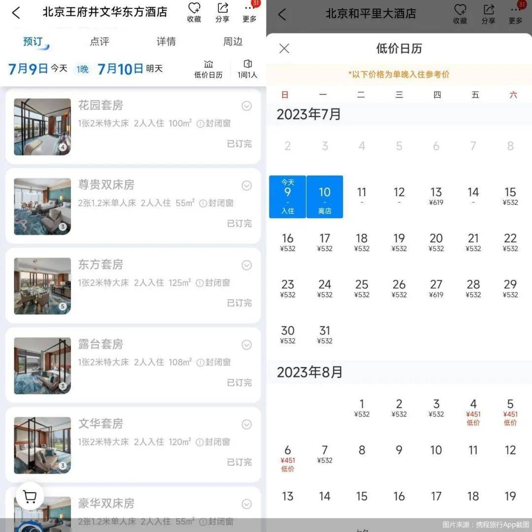 另据携程App,北京王府井文华东方酒店7月9日仅剩豪华大床房、尊贵大床房等房型,平时在万元以上的花园套房、东方套房等房型已被预订一空。王府井地区酒店市场呈现出供不应求的现象。