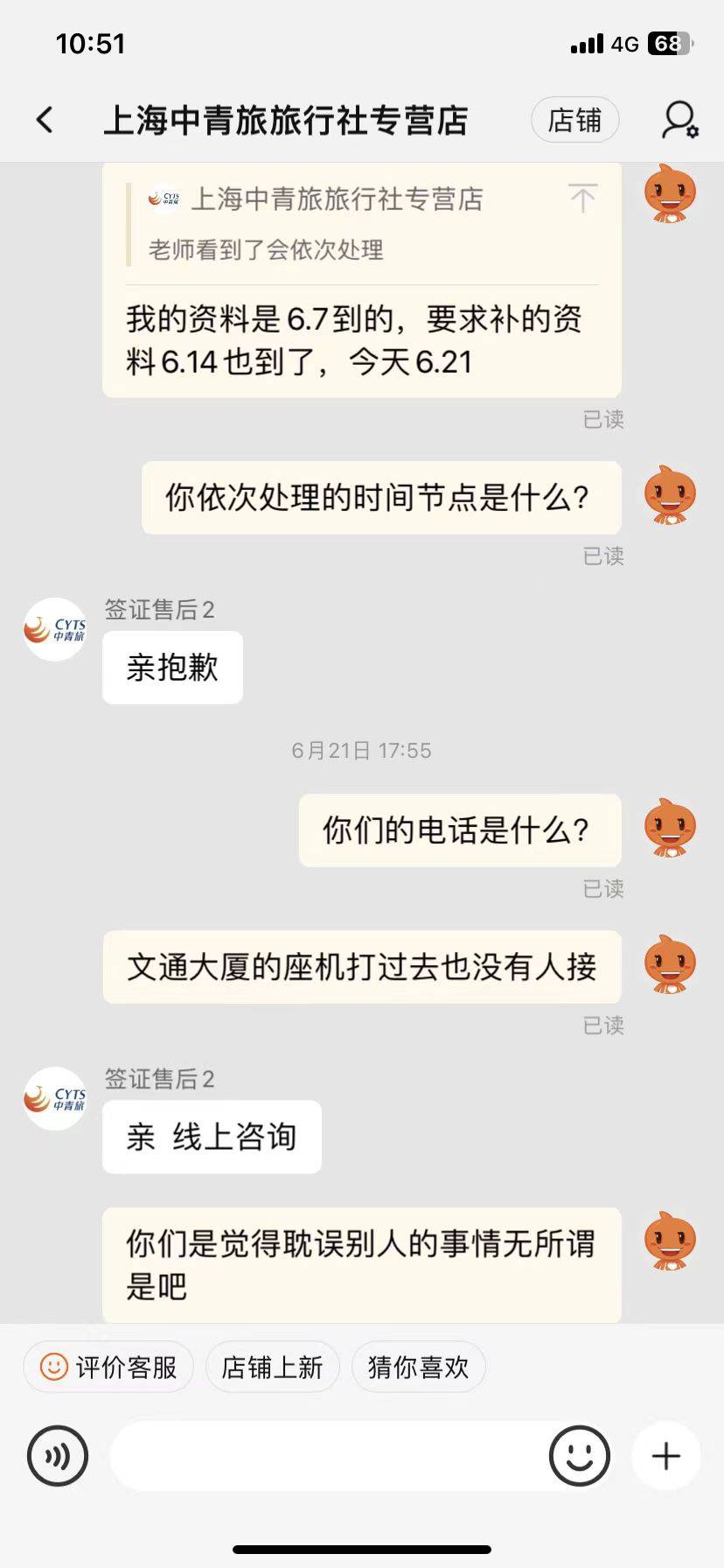 尽管盛女士的困境已有突破,但不少市民并没有那么幸运。事实上,近一个月时间来,这家“上海中青旅旅行社”的代办签证业务正频频引发争议。例如,网友年女士告诉记者,她于5月28日邮寄材料办理日本签证,直至约定好的10个工作日已过,方才从客服处得知旅行社根本未开始审核材料,“本来计划6月18日出行,实在来不及只能改签机票酒店。”网友费女士在办理泰国电子落地签过程中,则3次被要求补交清单中根本未有规定的材料,最终在“层层加码”中出签失败……
