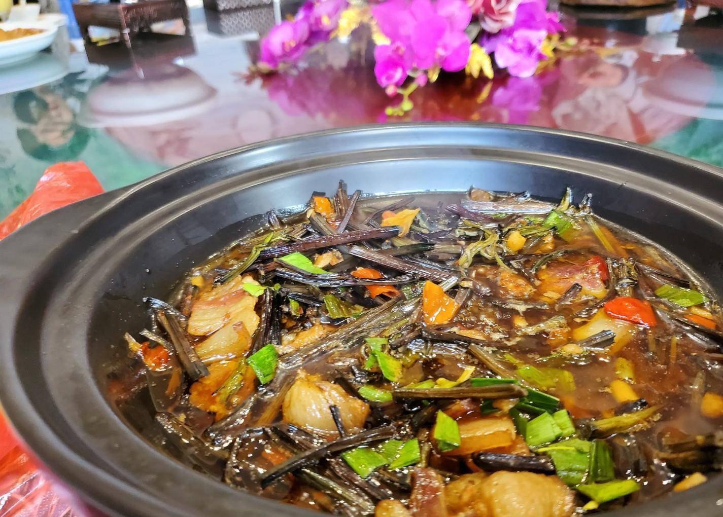 小马推荐的第2个美食就是锅子,在宁国人的心目中,最让人怀念的家乡菜那么一定非锅子莫属。不论是冬天还是春天,不论是在餐厅还是在家里请客,如果桌子上没有4-5个炖锅,那么这桌菜似乎都不算完美。锅子的种类丰富,比如最常见的一定是炖鸭子,炖鱼头,腊肉炖蕨菜干,腊肉炖笋干等等。虽然是锅子但是和火锅或者锅仔还是有一些不同,宁国的锅子大都是比较重口味,重油重盐重酱油,因此锅子往往看起来都比较的种颜色,不过特别的下饭。