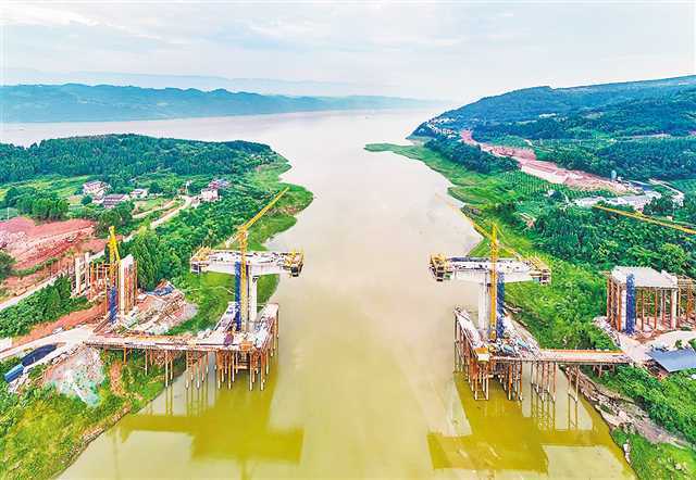 7月8日,从空中俯瞰忠石(忠县县城至石宝寨)沿江旅游公路,建设中的兰家山大桥宏伟壮观。