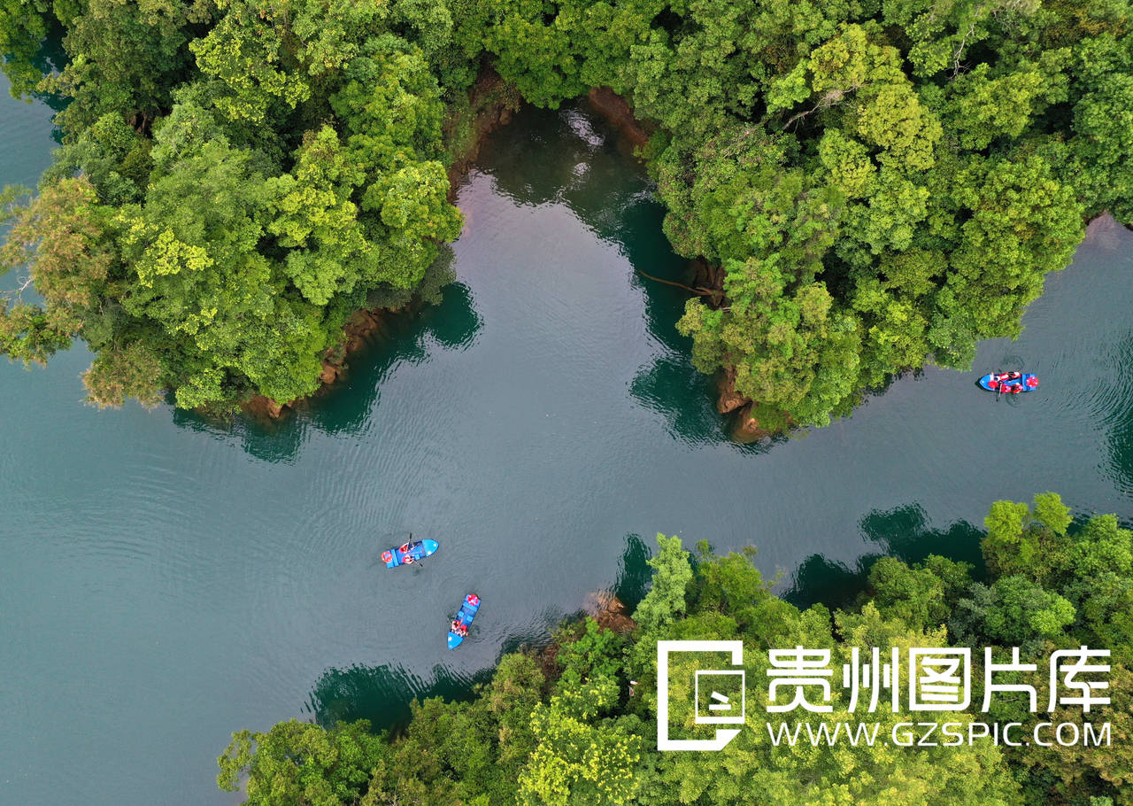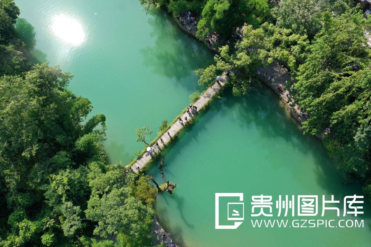 雨后的贵州省黔南布依族苗族自治州荔波县小七孔景区绿意葱茏、流水潺潺、碧水盈盈,秀丽的景色令不少游客心旷神怡陶醉其间。