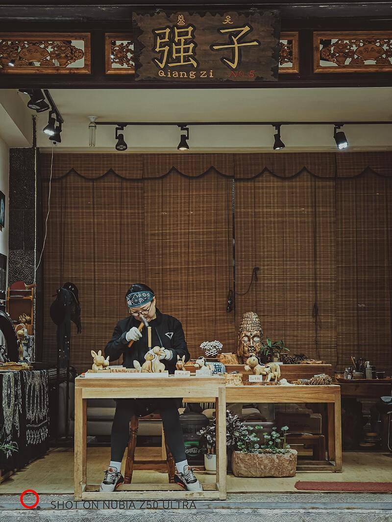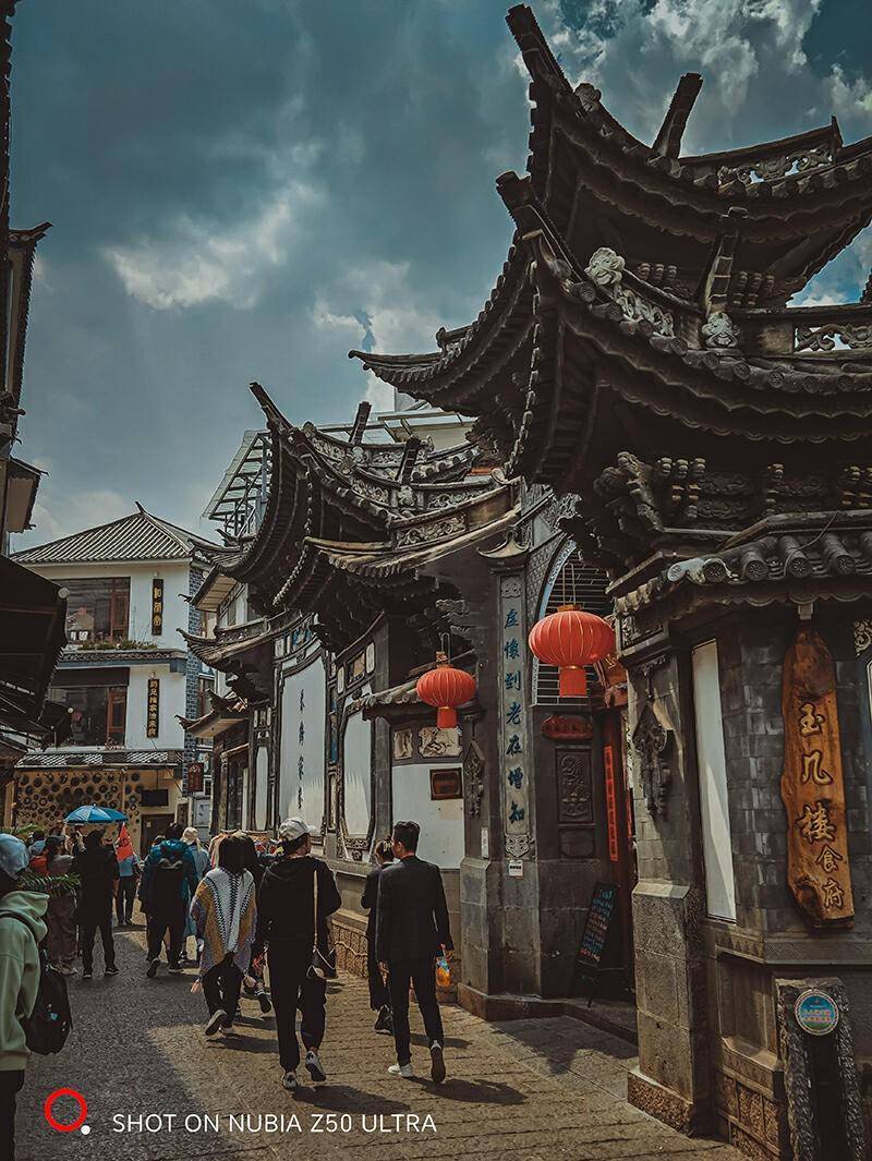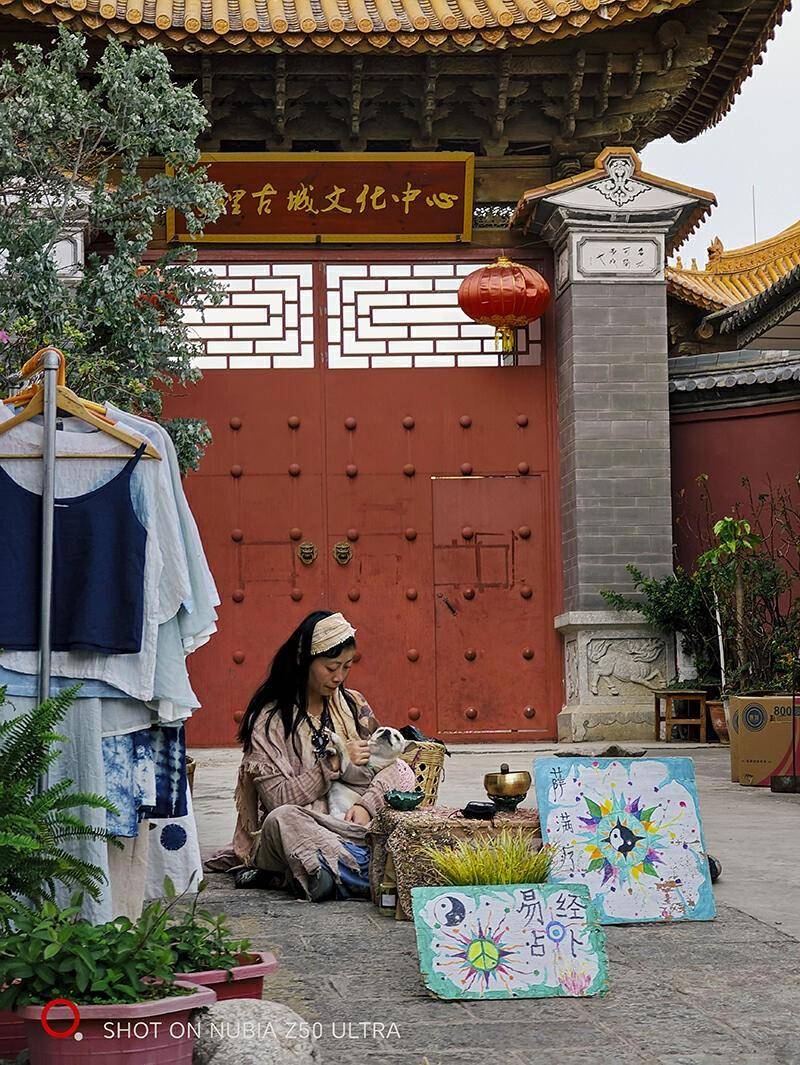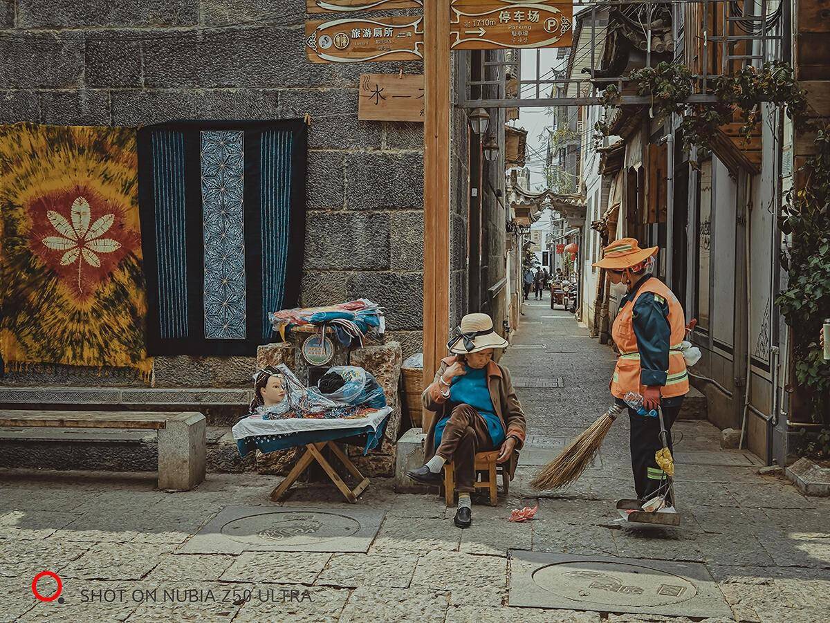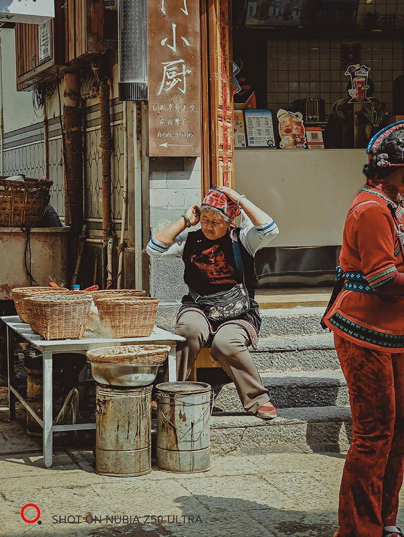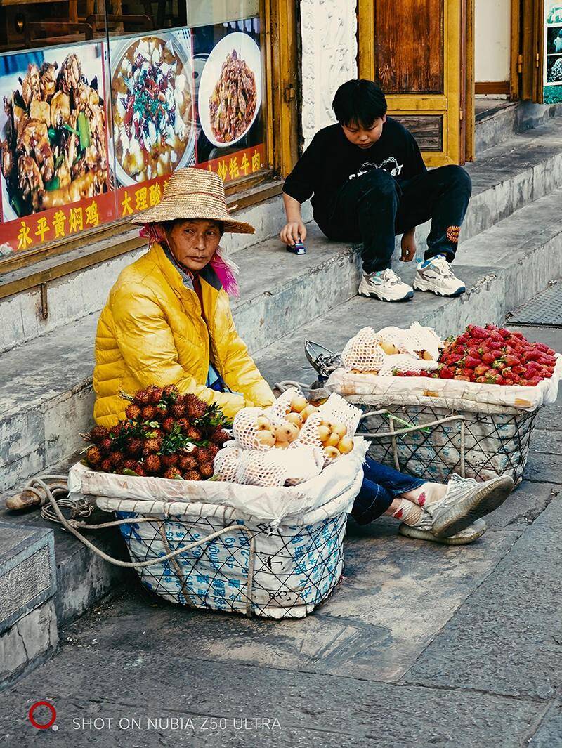 古城里面有很多这样挑着扁担的本地人,贩卖一些本地的鲜果子,这种场景下我觉得使用努比亚Z50 Ultra里面“人文街拍”的“大师人像”滤镜,拍照会特别有感觉。