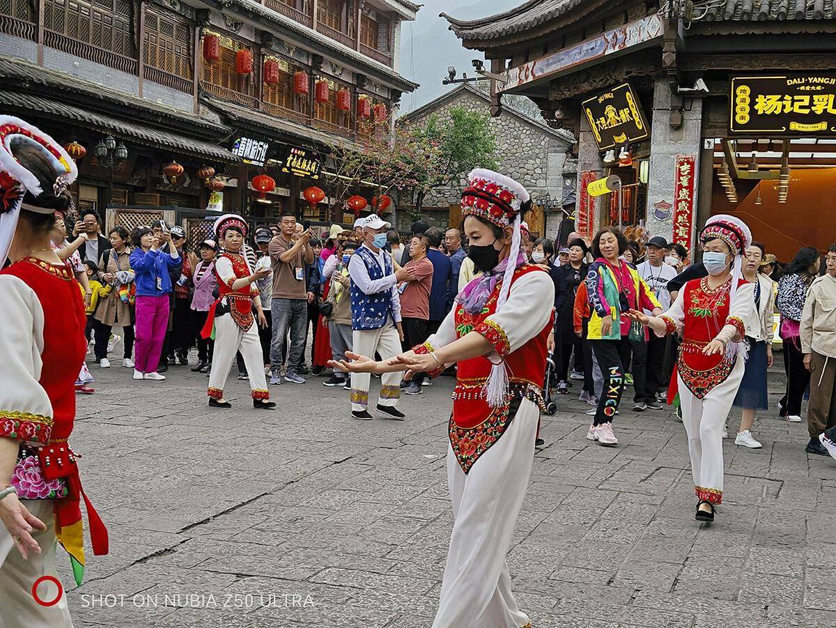慢悠悠的溜达在大理古城的石板路上,这个古城除了城门还有点历史的风貌,其他都变成了现代商业街了。这次运气挺好,遇到了在跳白族传统舞蹈的白族姐姐们,现场很是热闹。热闹繁杂的游客们从我身旁来来往往。