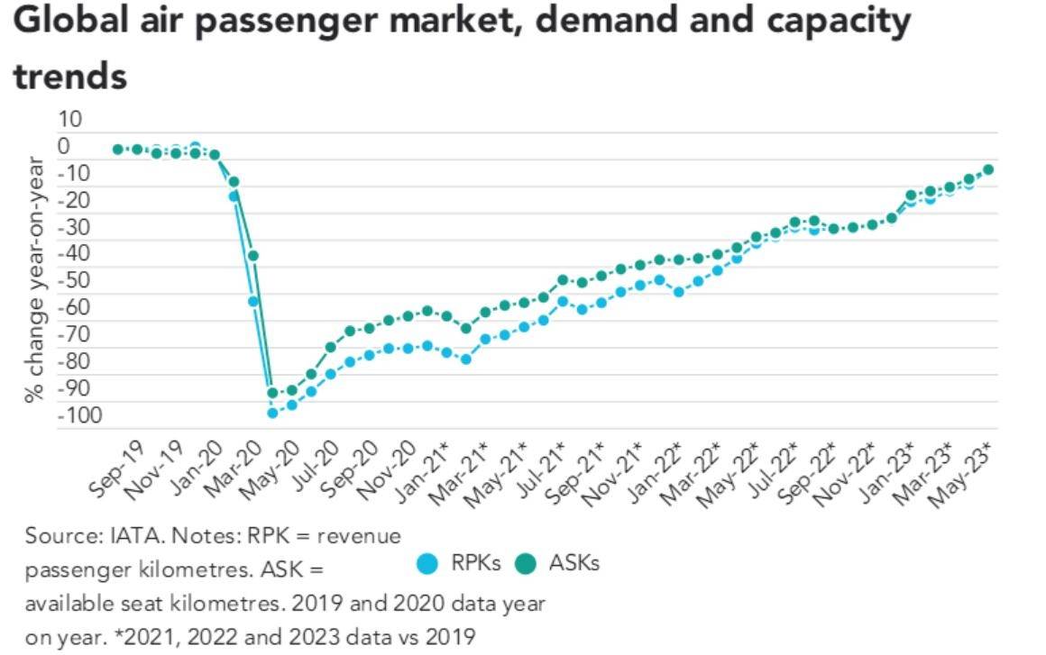 以收入客公里(RPK)来衡量,5月全球国内市场的客运量比2019年水平高出5.3%,连续第二个月超出疫情前数据,国际市场客运量为疫情前水平的90.8%。得益于关键的中国市场的再次放开,自2023年以来,国际市场客运量这一指标已大幅上升。