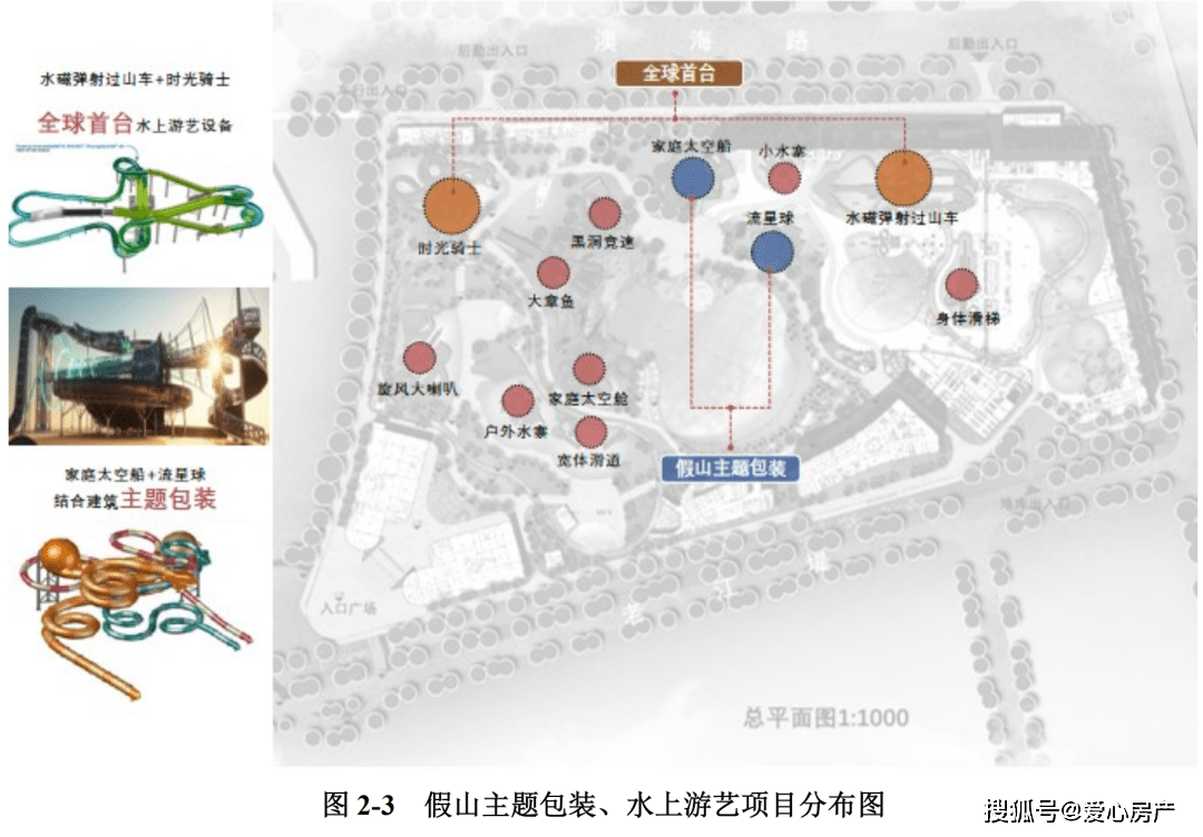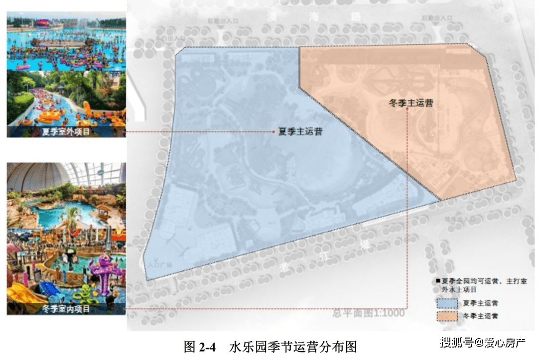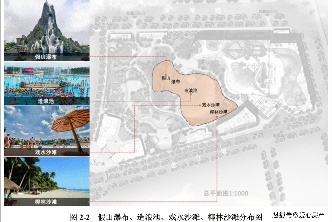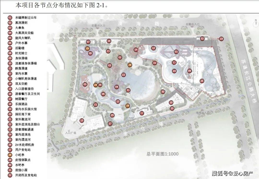 本项目基地内主要游乐设施形态分为室内、室外游乐区域两大类,其中室内管建设用地预 估约 3.6 公顷,室外区域占地约 9.4 公顷。项目主要包括 1 幢11层高层乐园酒店、1幢2层室内水乐园场馆,1幢3层后勤楼,1幢2层入口游客接待(地下一层为车库),2幢2层特色餐厅及卫生间,1个游客潜艇通道,1 个用户变电站,3 个小吃亭,1 个 2 层的开闭所及变电站,15个度假小屋以及 1 个地下车库;室内外有多个钢结构游乐设备和混凝土结构的漂流河、造浪池,并在地面或地下设置对应的设备机房;还有两个构筑物为皮筏领取点及水吧亭。