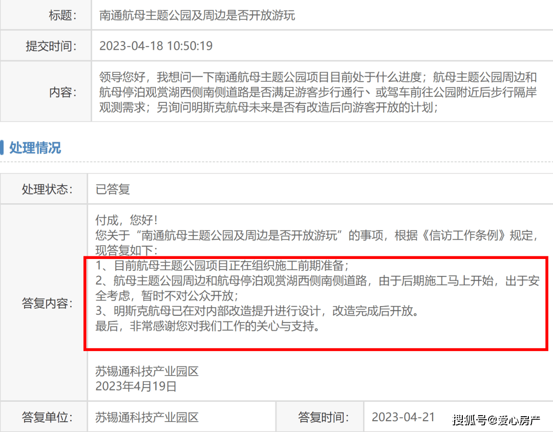 此前,有市民在南通市政府官网咨询“南通航母主题公园及周边是否开放游玩”的问题,官方给予了明确的答复——航母主题公园项目正在组织施工前期准备。