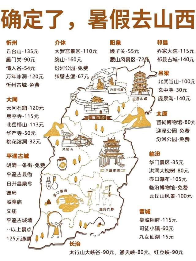山西必去的景点:五台山、云冈石窟、壶口瀑布、平遥古城、乔家大院、雁门关、悬空寺、晋祠、太原古县城等,这些地方都有着独特的魅力和美丽的风景,让人流连忘返√