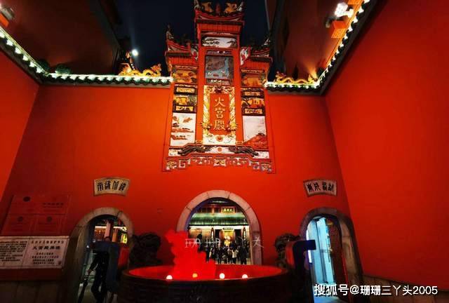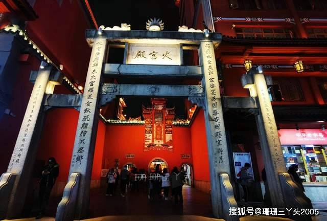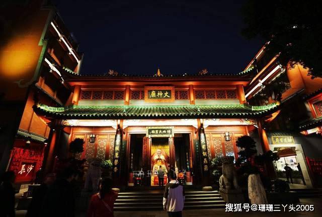 在马路一边,看着在火宫殿门楼进出的人流,珊珊三丫头:这里有什么历史呢?长沙,在荆楚时期先民就有祭祀火神的习俗,而火宫殿,就是祭祀火神的庙宇,它又名"乾元宫",建于明万历五年(1577年)。清乾隆12年及道光六年两次重修的建筑,火宫殿附有火神庙、财神庙、弥陀阁、普慈阁等建筑,面积有6000平方米,建筑非常宏伟 。有庙则聚人气,到了晚清,这里成为集合祭祀、看戏、听书、观艺、小吃的庙市。1938年的文夕大火,殿宇焚毁殆尽,唯一留下了牌楼。1941年再修,恢复火神庙堂,同时成为了小吃闹市。到1956年公私合营时,成立火宫殿饮食店。在2002年,火神庙在原址上重建,重塑火神像,古戏台,漆饰火宫殿牌楼,增设石牌坊等,现庙宇气势十分雄伟。