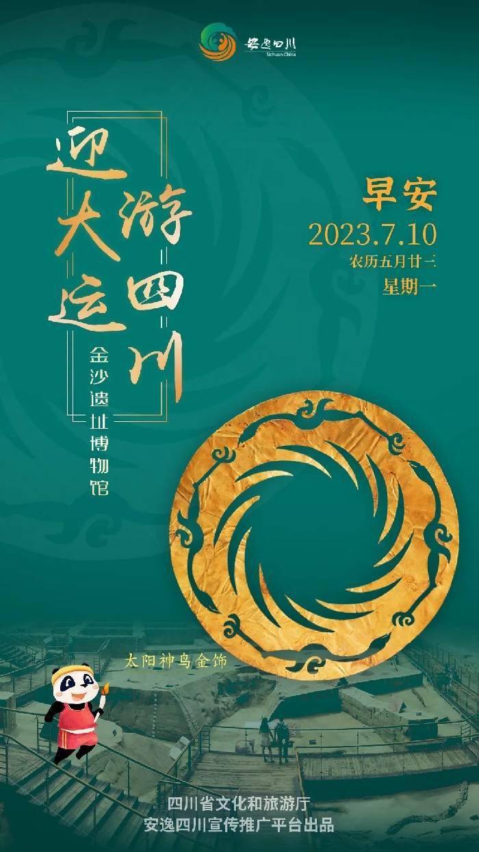 今日安逸四川日历海报“迎大运·游四川”之旅走进金沙遗址博物馆,在太阳神鸟金饰中看见古蜀之光。