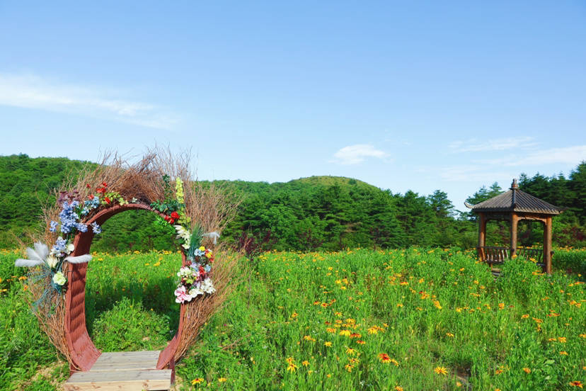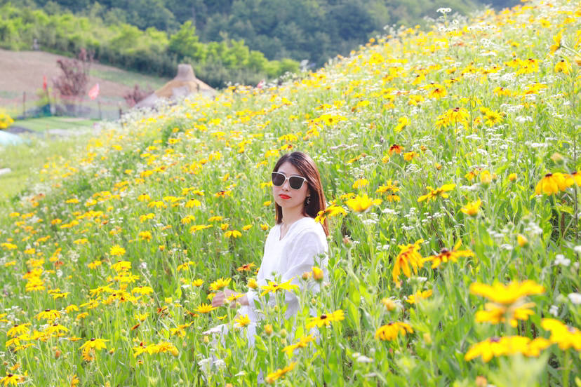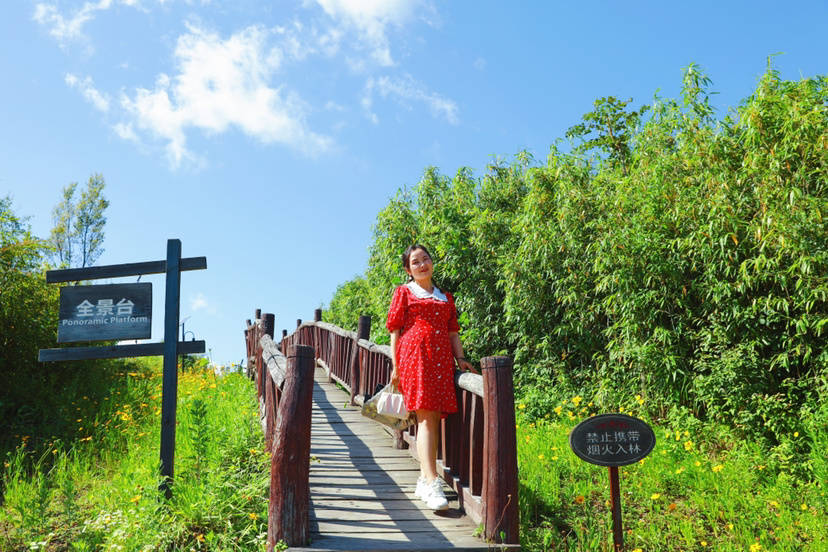 步入草坝景区,首先映入眼帘的大片花海,黄色的金光菊迎风摇曳,花团锦簇彩蝶飞舞,微风轻拂,在花海中徜徉,好不惬意。花海中还安装了很多浪漫的拍照设施,网红打卡点“天空之镜”,清晰的倒影,美得恍如隔世。
