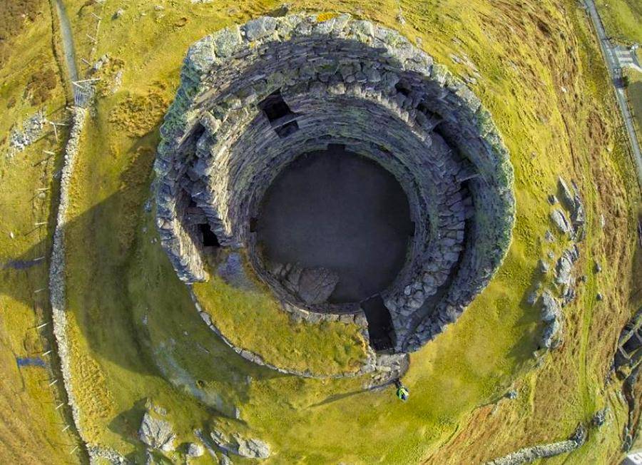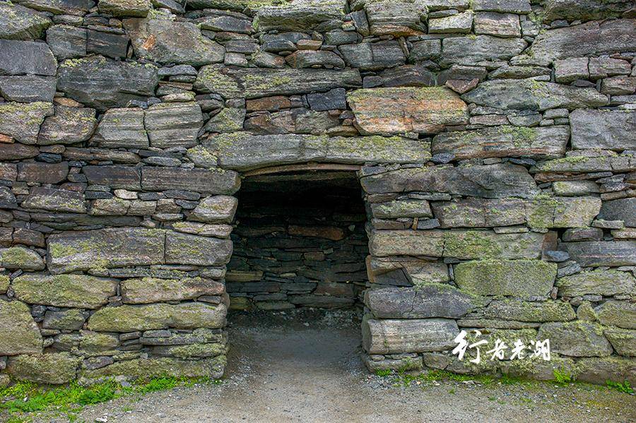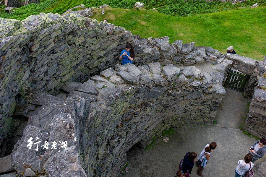 爬上山坡,经过一片欧石南花丛,带着敬畏走到古堡门前,内部结构展示了被尘封的史前世界。从毁损的侧面可以看出,这座座“双壁干石塔"外墙向内逐渐倾斜收缩,低矮的门依然完好,东面残留的墙高达9米多,最低的墙壁只有一人多高。