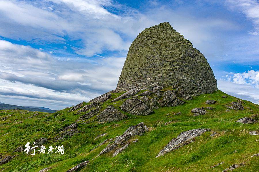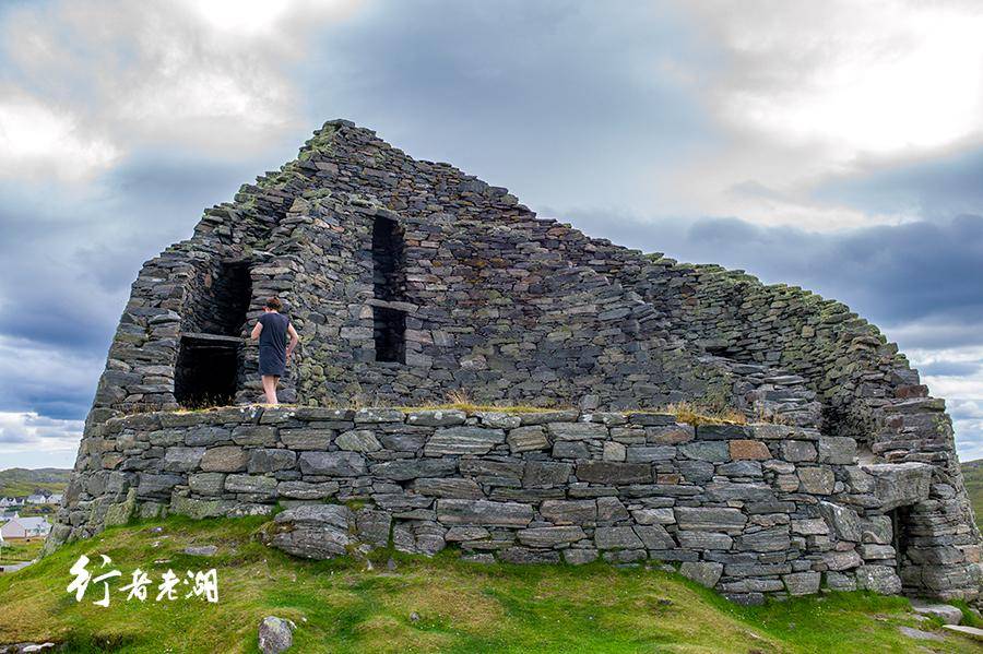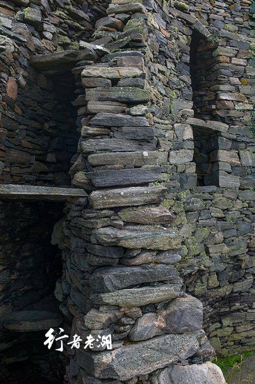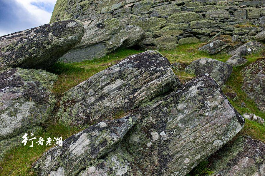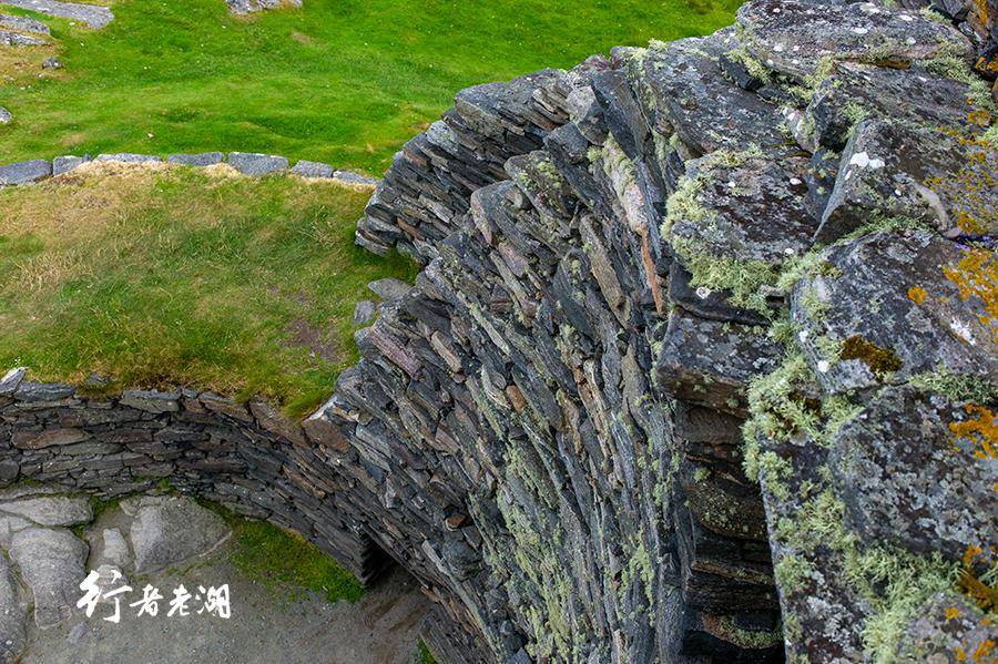 古堡也被称为“石塔”。“干石双壁”的“干石”(Dry stone)架构,是纯粹用石头建造结构法,挑选立面互为契合、利于承重的石块,无需砂浆,互相咬合垒起。外赫布里底群岛的“黑屋”(Black Houses)也是同样的建筑方法,在几乎没有树木的海岛,无疑是最佳选择。