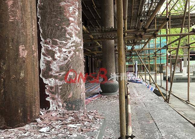 由后门进入,路过的不慎堂、庆系堂,再到正殿五王殿,都已经搭设起了脚手架,串联建筑物之间的走廊,一根根柱子表面都被磨掉了一层皮,柱子光秃秃的,摸起来有些毛糙。