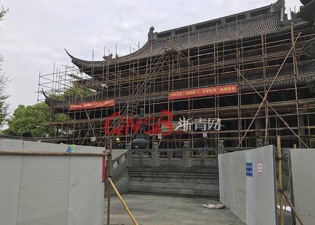 钱王祠里的正殿五王殿正在搭设脚手架。