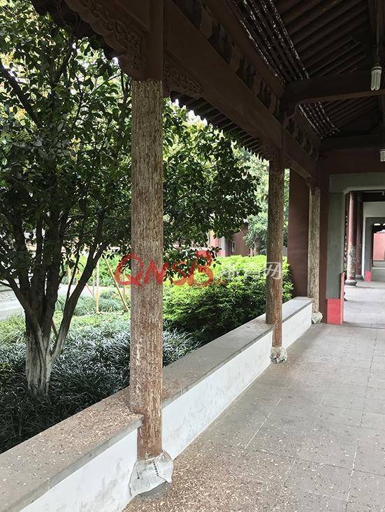 钱王祠功臣堂外的立柱已经完成了斑驳脱落表面的清理工作。