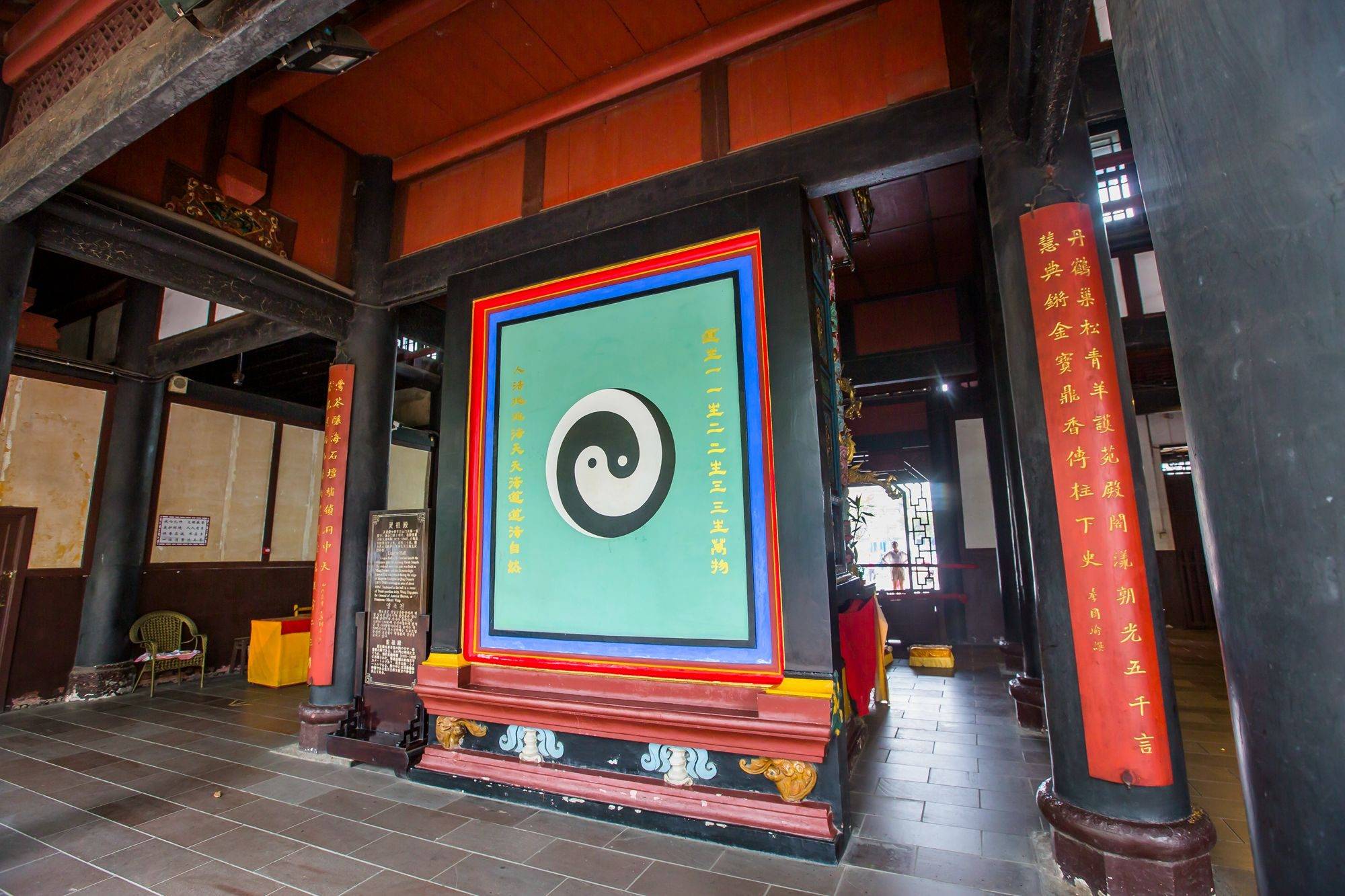 八卦亭极为华丽,翘起的檐角线条自然流畅,精雕细琢。亭顶各不相同,上层覆着黄色琉璃瓦,下层则是绿色琉璃瓦。亭子下方有八根雕龙金柱,阳光一照便熠熠生辉,尽显富丽堂皇。
