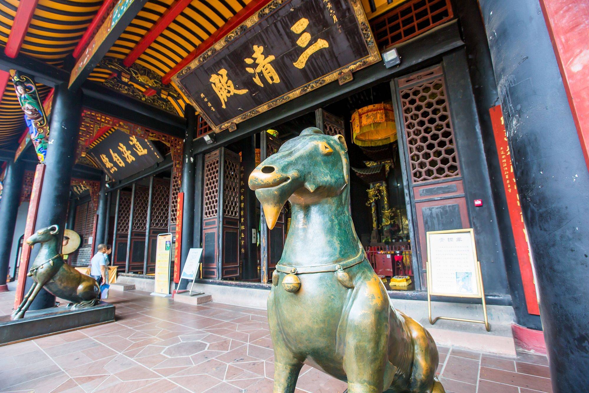 三清殿前供奉有两只黄铜铸成的铜羊,俗称青羊,是青羊宫镇馆之宝的仿制品。其中独角青羊是民间家喻户晓的神羊,外型似羊非羊,集合了十二生肖于一体,据说哪里有病痛摸一下羊所相对的部位就能痊愈。