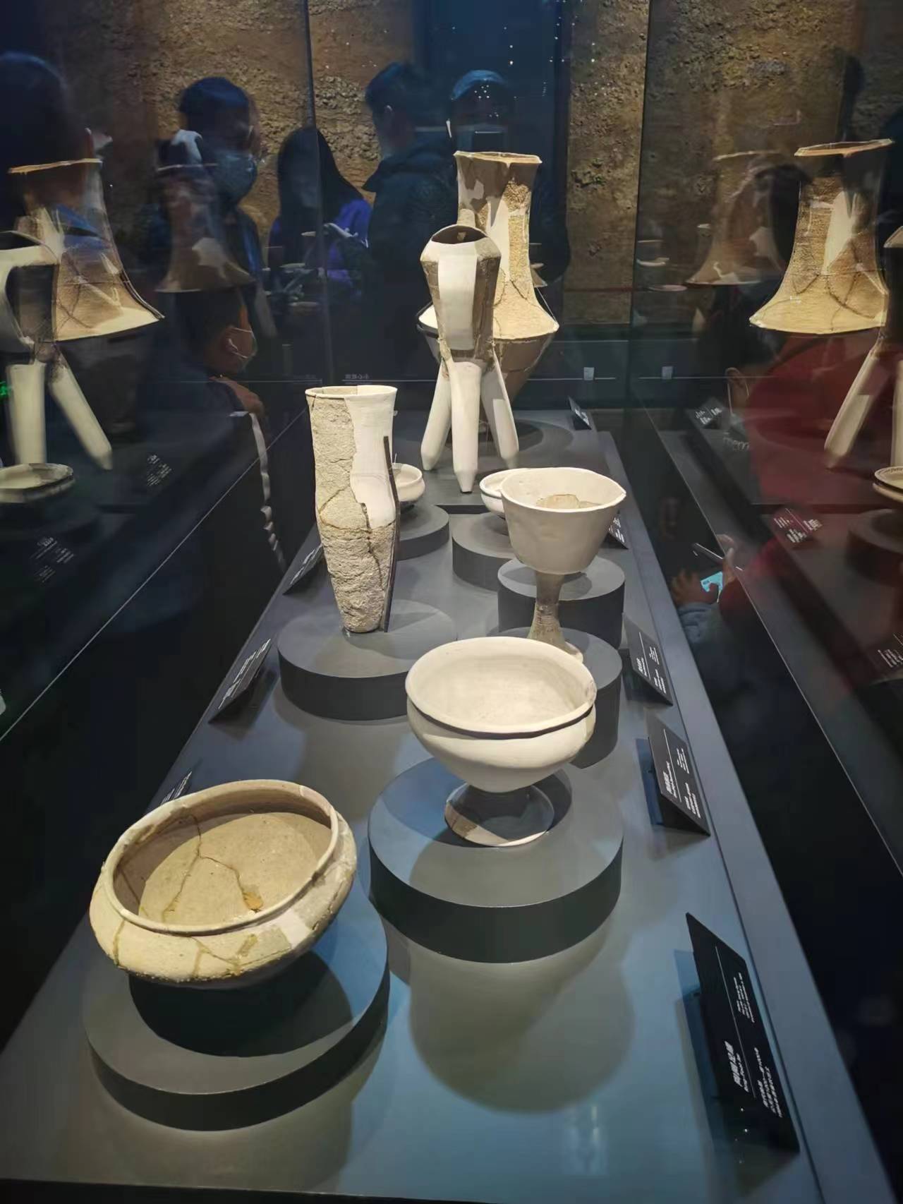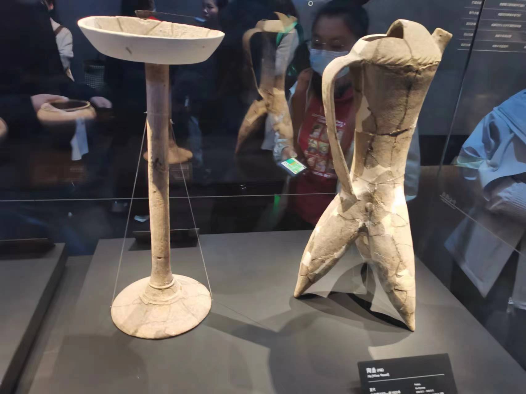 走入三星堆遗址博物馆,首先是展示当时人们生活用的陶器,可以窥见人们当时的生活,盘子很高,因为当时没有桌子,人们用餐时席地而坐,酒具三足中空底部可以加热。
