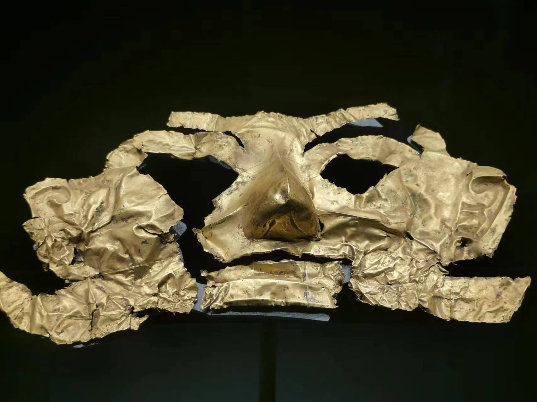 展厅内同时展出了金箔虎型饰,金箔四叉型饰,金料块等,还有金面罩,与古希腊、古埃及等地区的金面罩外形相似,推测古蜀人采借吸收了西亚近东类似的文明。因展品实在是太丰富,不赘述了。