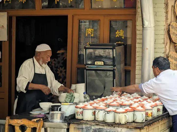 即使锅包肉、烤包子、各种烧烤都不够胃口,也可以在茶室点上一壶茶,看看附近维吾尔族长老的音乐表演,让自己安静地坐着。