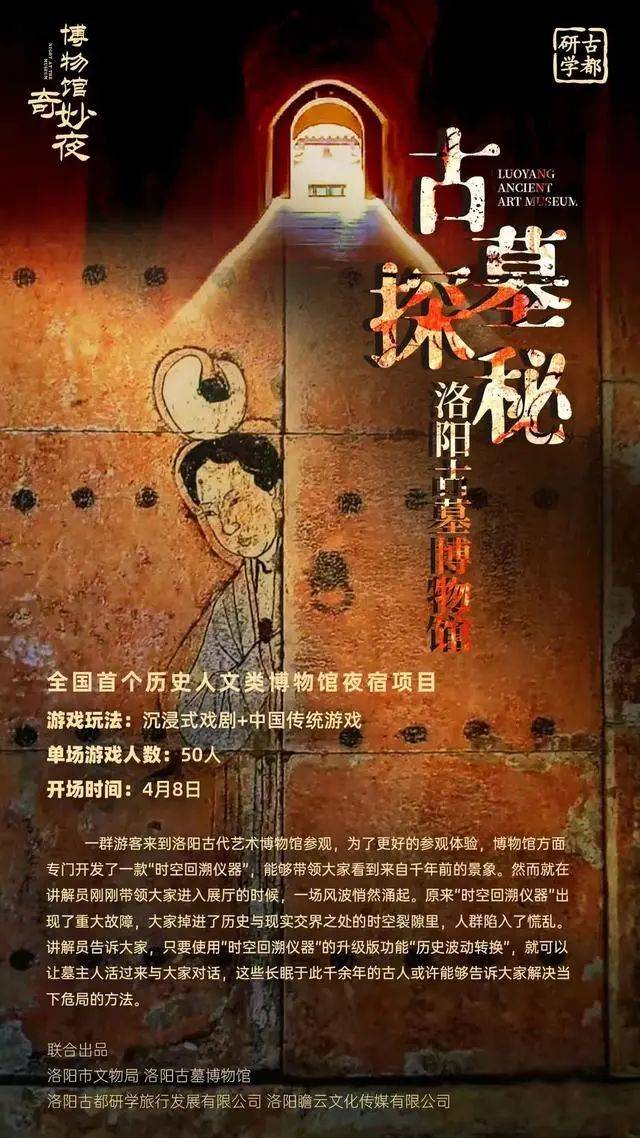 除了科技以外,博物馆也可以结合剧本杀的形式,让游客在故事中沉浸式体验历史文化。例如近期洛阳推出的‘神都奇幻志’全城剧本杀活动,其中就包括洛阳古墓博物馆将于4月8日举办“古墓探秘”活动,该项目由沉浸式戏剧、中国传统游戏和夜宿构成一整夜的体验。一群游客在洛阳古墓博物馆参观时,体验“时空回溯仪器”回看千年前的景象,然而仪器发生重大故障,大家掉进历史与现实交界处的时空裂隙,必须运用仪器的“历史波动转换”功能,让长眠于此千余年的古墓主人复活,向其了解解决危机的办法。该活动推出以后受到市场的广泛关注。