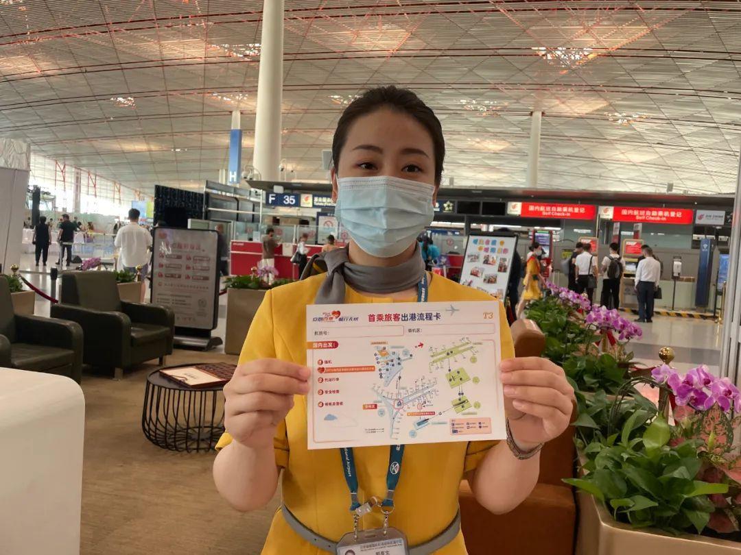 常军:“首程无忧”服务产品实际上是针对我们首次进出首都机场的旅客。我有一张针对初次旅客的旅行提醒卡,告知旅客办理乘机手续的地点,以及行李托运、安检、候机的一些相关提醒,让旅客出行无忧。如果有需要的旅客,经过他的同意,我们还可以在他身上贴上爱心贴纸,以便我们的安检人员识别,以便第一批旅客能够顺利出行。