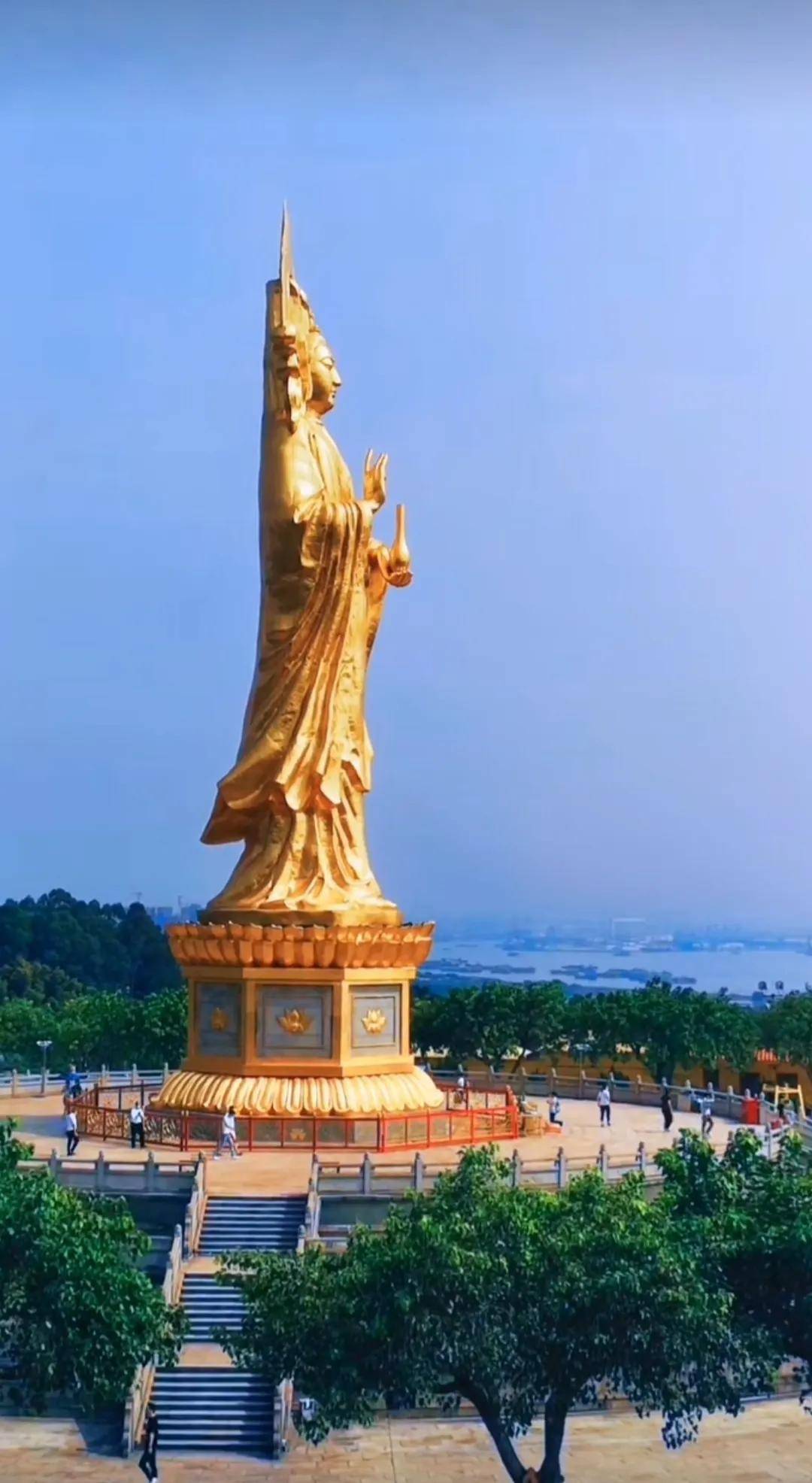 观音雕像总高度40.88米。它由120吨青铜制成,覆盖着180两纯金。它是世界上最大的金箔青铜雕像。2000年4月,佛像被重建为金身,经佛教大师喷漆后,更加金碧辉煌。观音雕像位于东南18度。她庄严而仁慈地望着浩瀚的狮子海和珠江三角洲的大地。