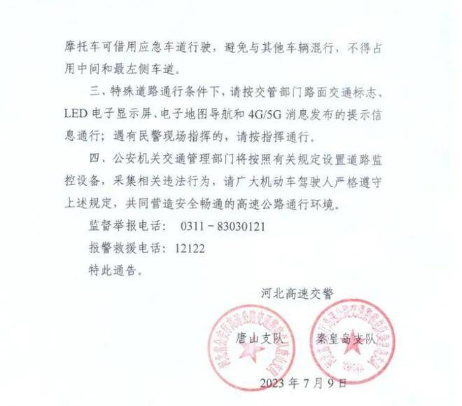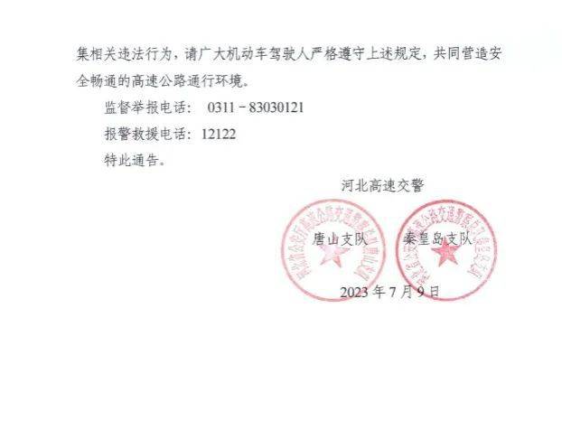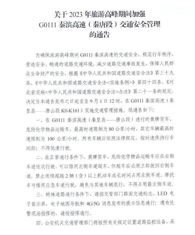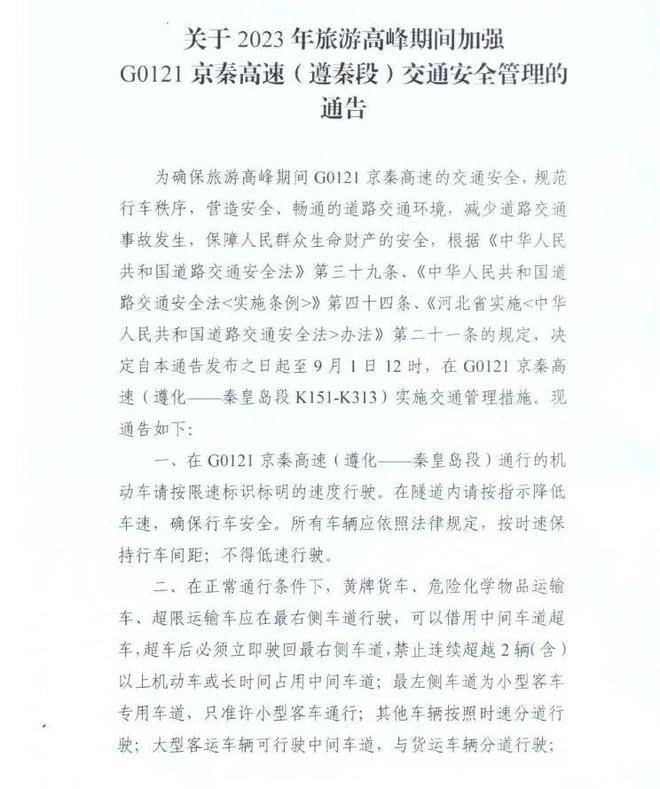 7月9日,河北高速交警唐山支队微信公众号刊发两则通告,即“关于2023年旅游高峰期间加强G0121京秦高速(遵秦段)交通安全管理的通告”“关于2023年旅游高峰期间加强G0111秦滨高速(秦唐段)交通安全管理的通告”,详情如下: