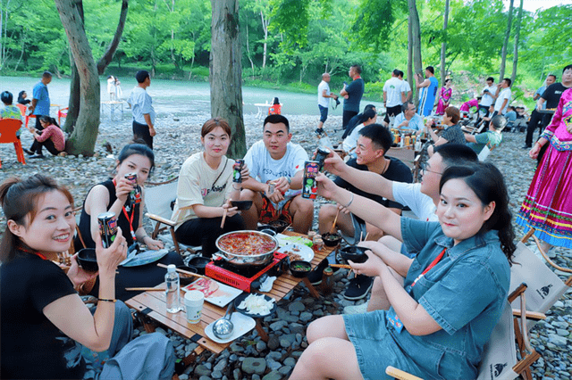 开漂仪式当天,试漂游客们在安全员指导下开启了凌霄河漂流下半程风情休闲漂试漂体验。游客们在缓流中荡漾,品味山水柔情的浪漫情调,沿岸植被茂盛,美不胜收。水流湍急之时,游客不时发出阵阵尖叫,尽情地享受着惬意与激情。下半场程漂流终点便是卢家坝露营地。在这里,游客们背山面水感受着盛夏久违的舒适与清凉。“露营+火锅”的组合让他们纵酒言欢,肆意感受舌尖上的热辣美食。