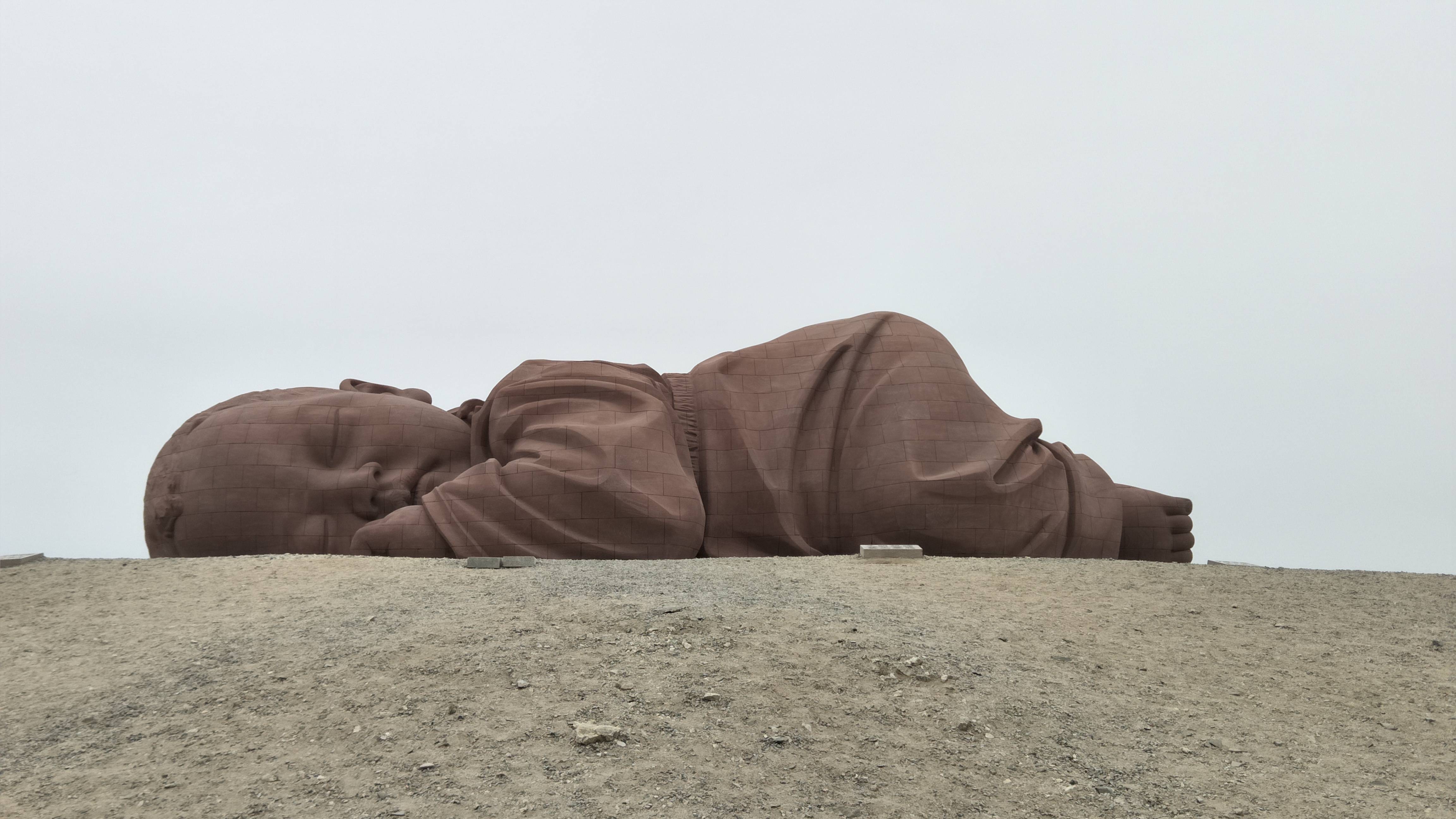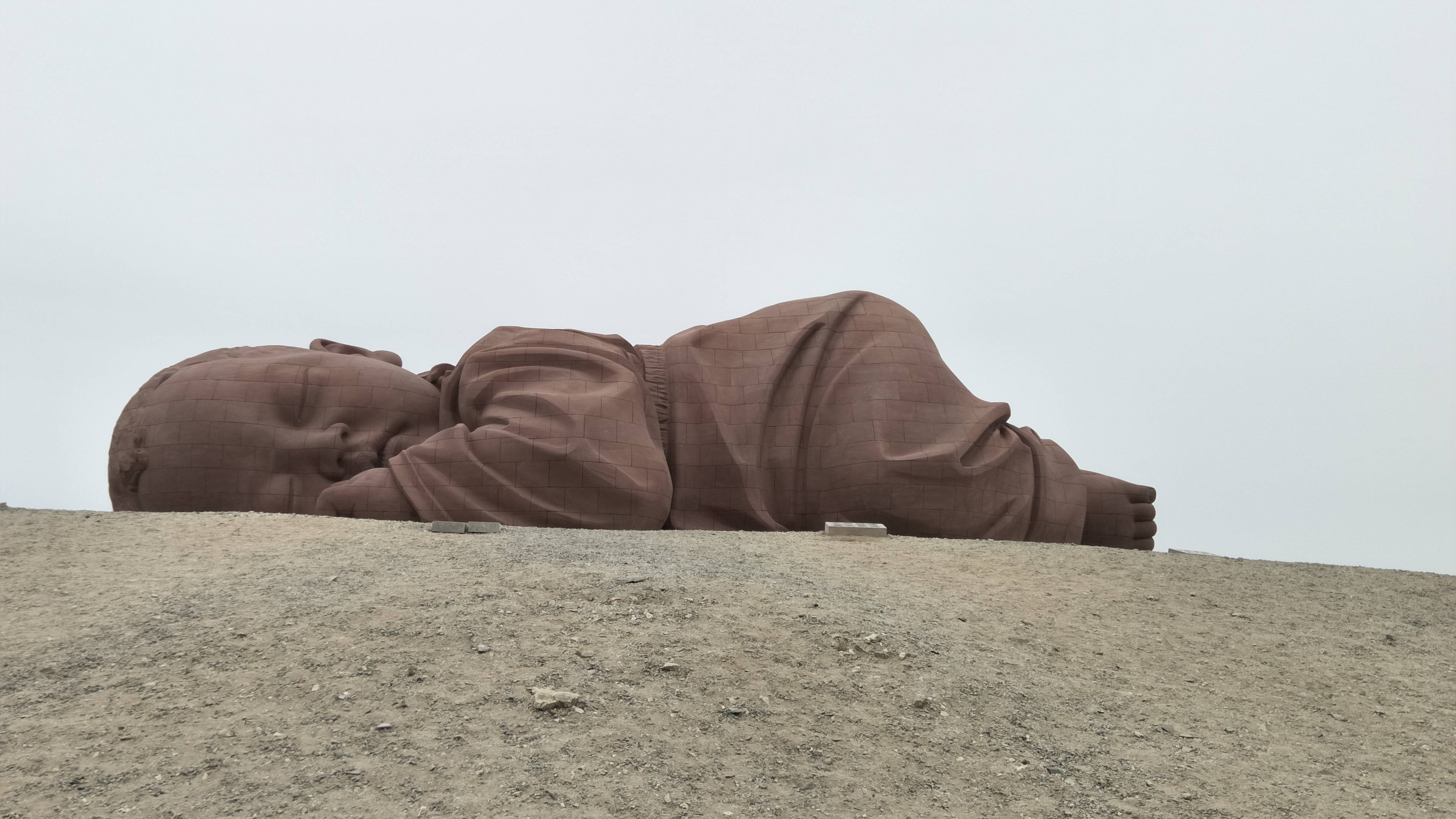 在路边一片荒漠沙土之上,远远可以看到一个“孩子”稳稳地趴在地上,无论外界自然条件多么恶劣,它却纹丝不动,这就是著名的“大地之子”雕像。