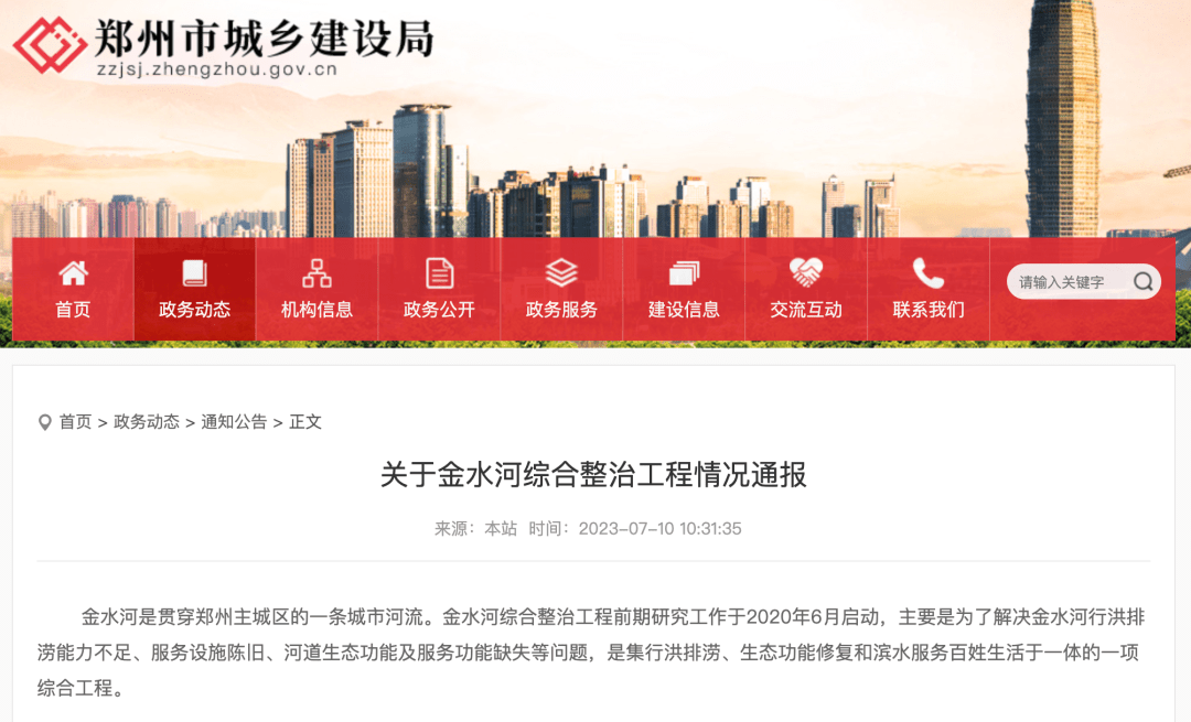 金水河是贯穿郑州主城区的一条城市河流。金水河综合整治工程前期研究工作于2020年6月启动,主要是为了解决金水河行洪排涝能力不足、服务设施陈旧、河道生态功能及服务功能缺失等问题,是集行洪排涝、生态功能修复和滨水服务百姓生活于一体的一项综合工程。
